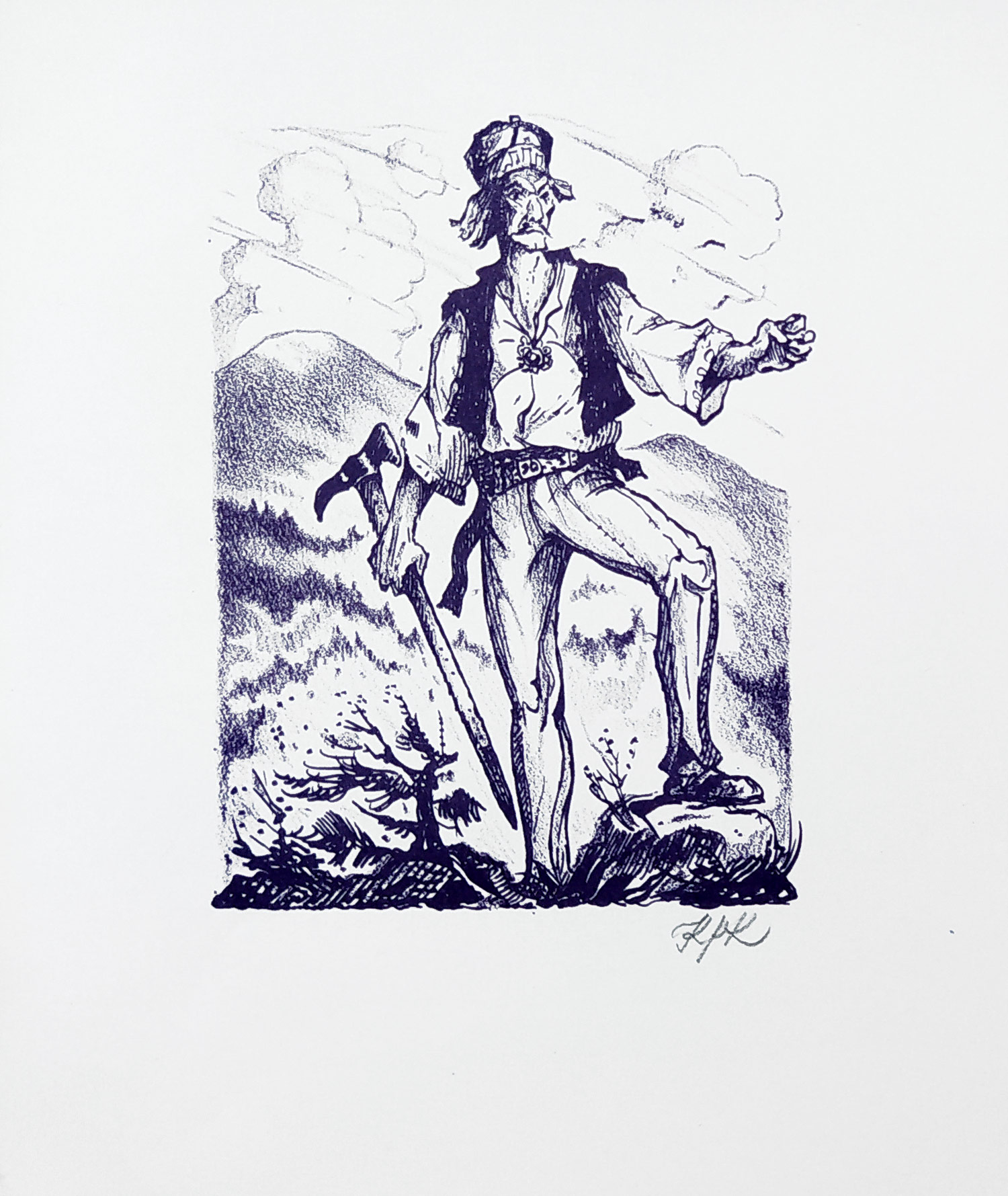 Konůpek Jan – Zbojník Ondráš, původní signovaná litografie, 1945. Litografie jako frontispice k nevydané knize Petra Bezruče Ondráš. Pro šestý svazek edice Solitaire v Praze 1945. Celkový rozměr: 23,1 cm × 18,3 cm.