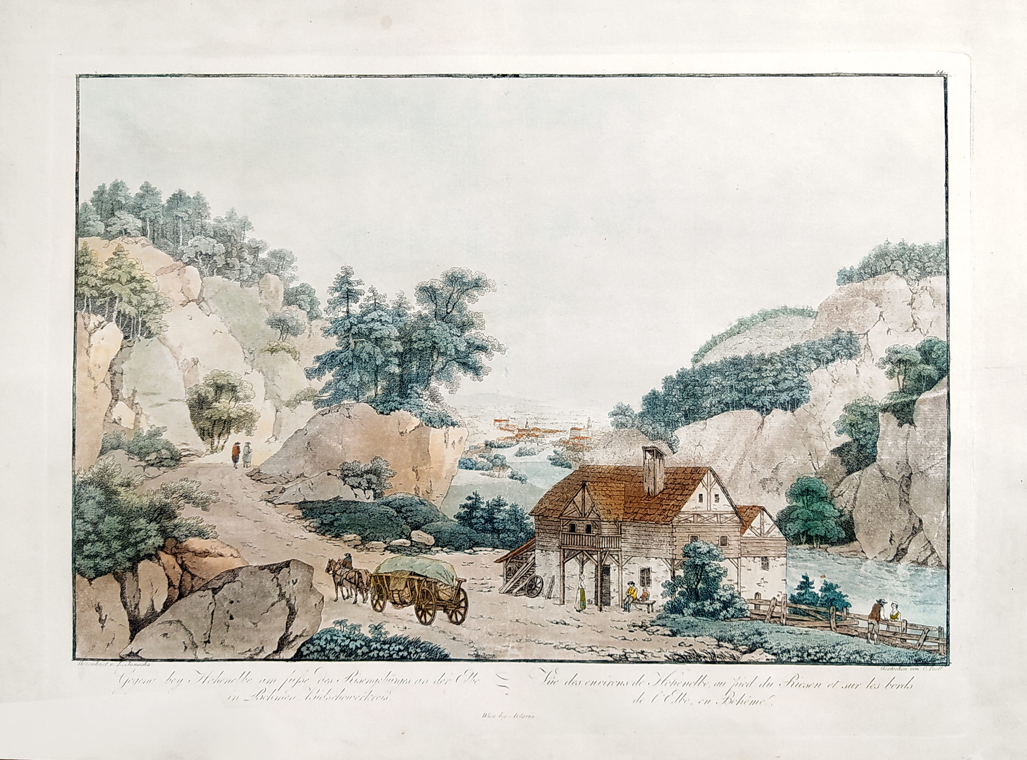 „Gegend bey Hohenelbe am Fusse des Risengebürges an der Elbe in Böhmen Bidschowerkreis - Vue des environs de... Bitschowerkreis.“ Podle předlohy L. Janschy leptal K. Postl.