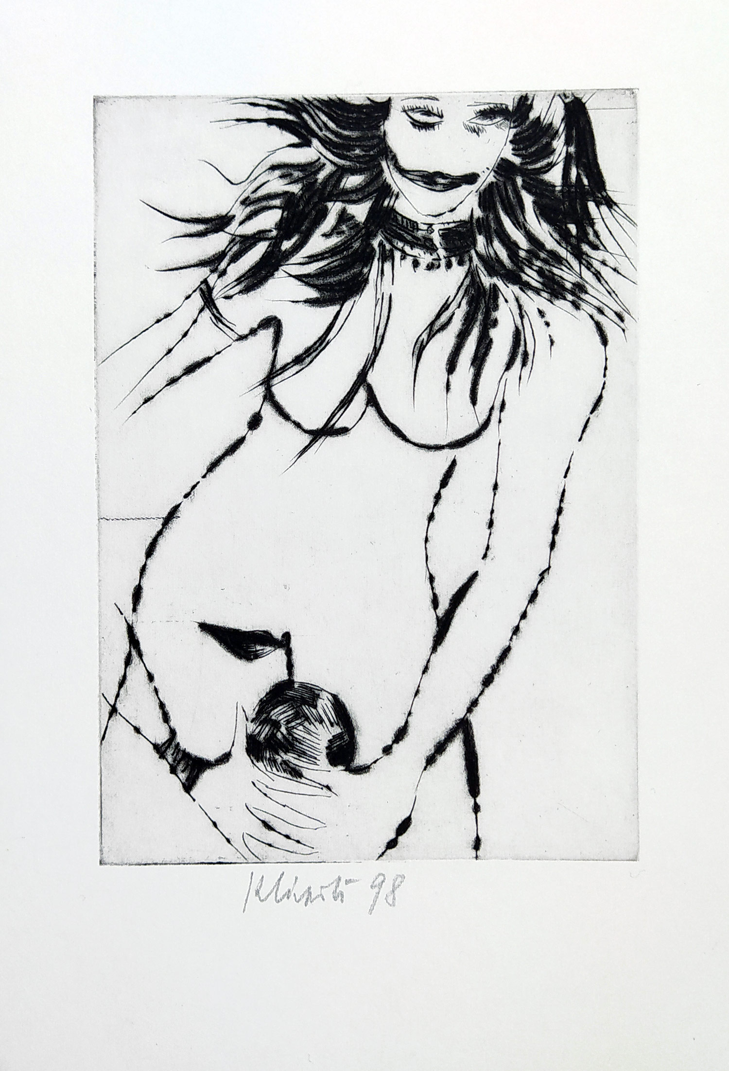 Klápště Jaroslav – Akt s jablkem, suchá jehla, 1998.