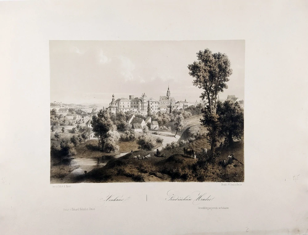 Jindřichův Hradec – August Haun, původní dvoubarevná litografie s podtiskem, 1860. Původní dvoubarevná litografie s podtiskem. Podle vlastní kresby litografoval August Haun. Pod vyobrazením dvojjazyčný název listu: „Neuhaus. | Jindřichůw Hradec.“ Vytiskl W. Korn v Berlíně, nakladatel Eduard Hölzel v Olomouci.