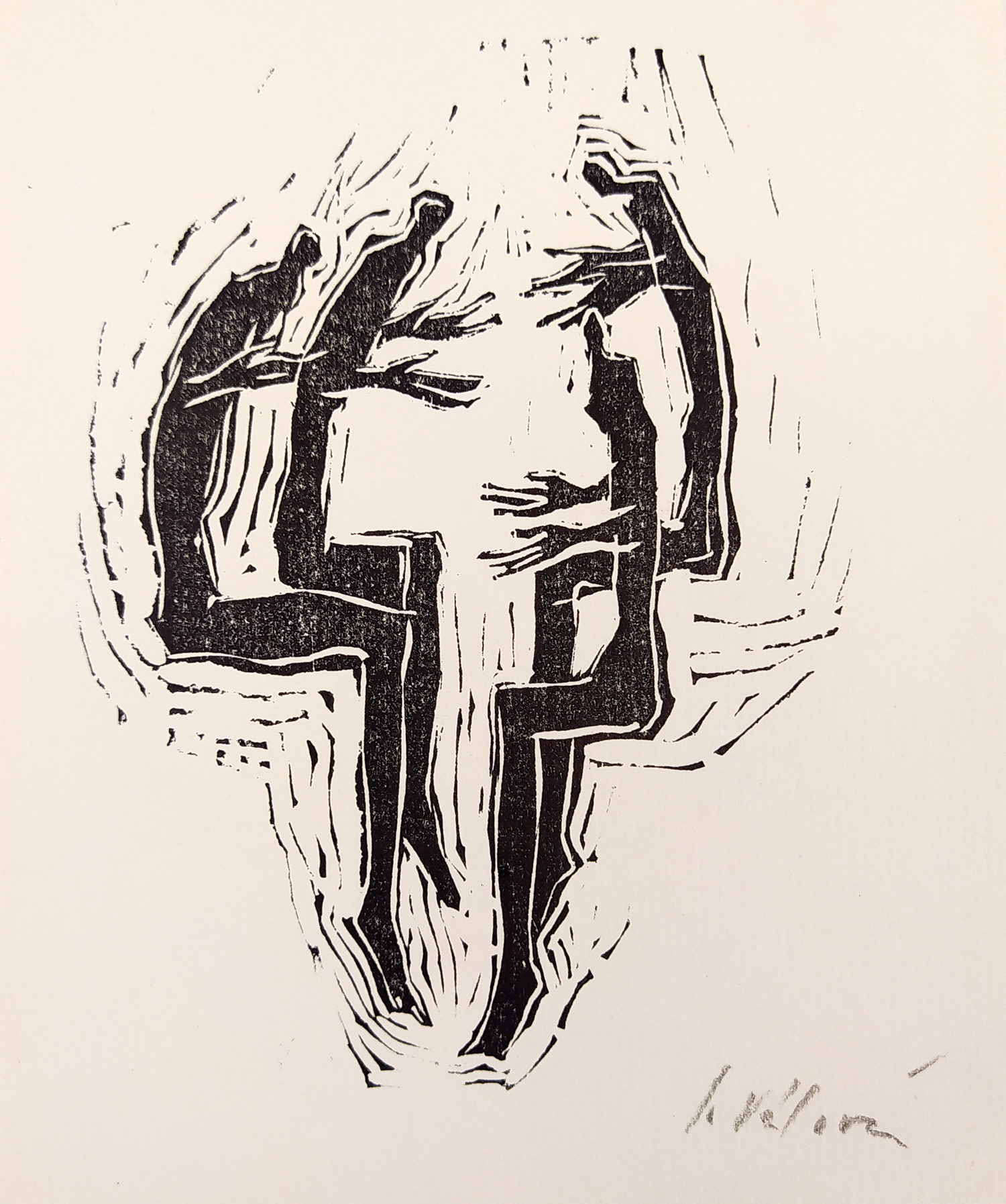 Válová Jitka – Sedící figury, původní linoryt, nedatováno. Signováno tužkou vpravo dole. Celkový rozměr: 14,9 cm × 12,4 cm.