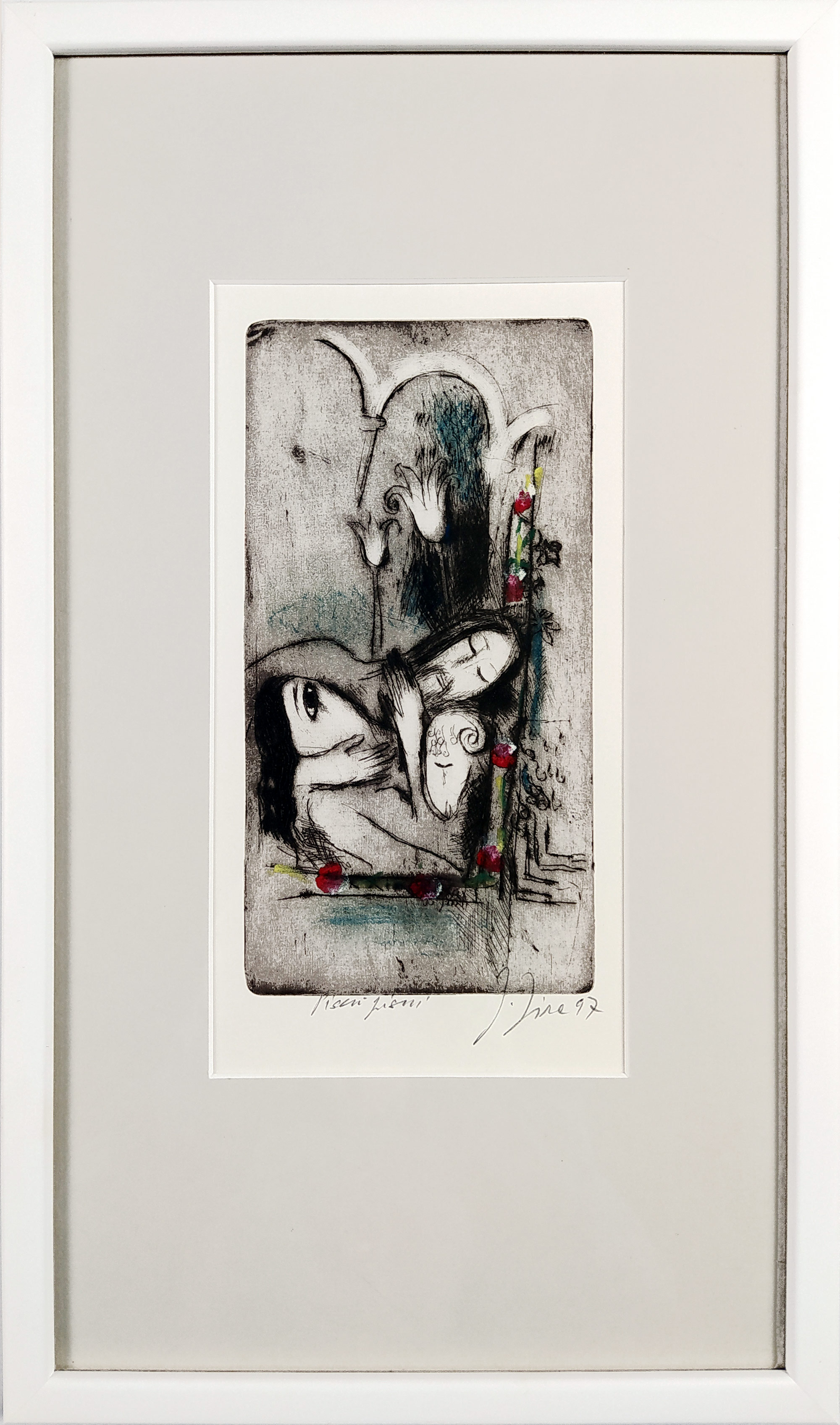 Jíra Josef – Píseň písní, barevná suchá jehla s podtiskem, 1997. Signováno tužkou vpravo dole s datací: J. Jíra 97. Celkový rozměr v rámu: 41,0 cm × 24,0 cm.
