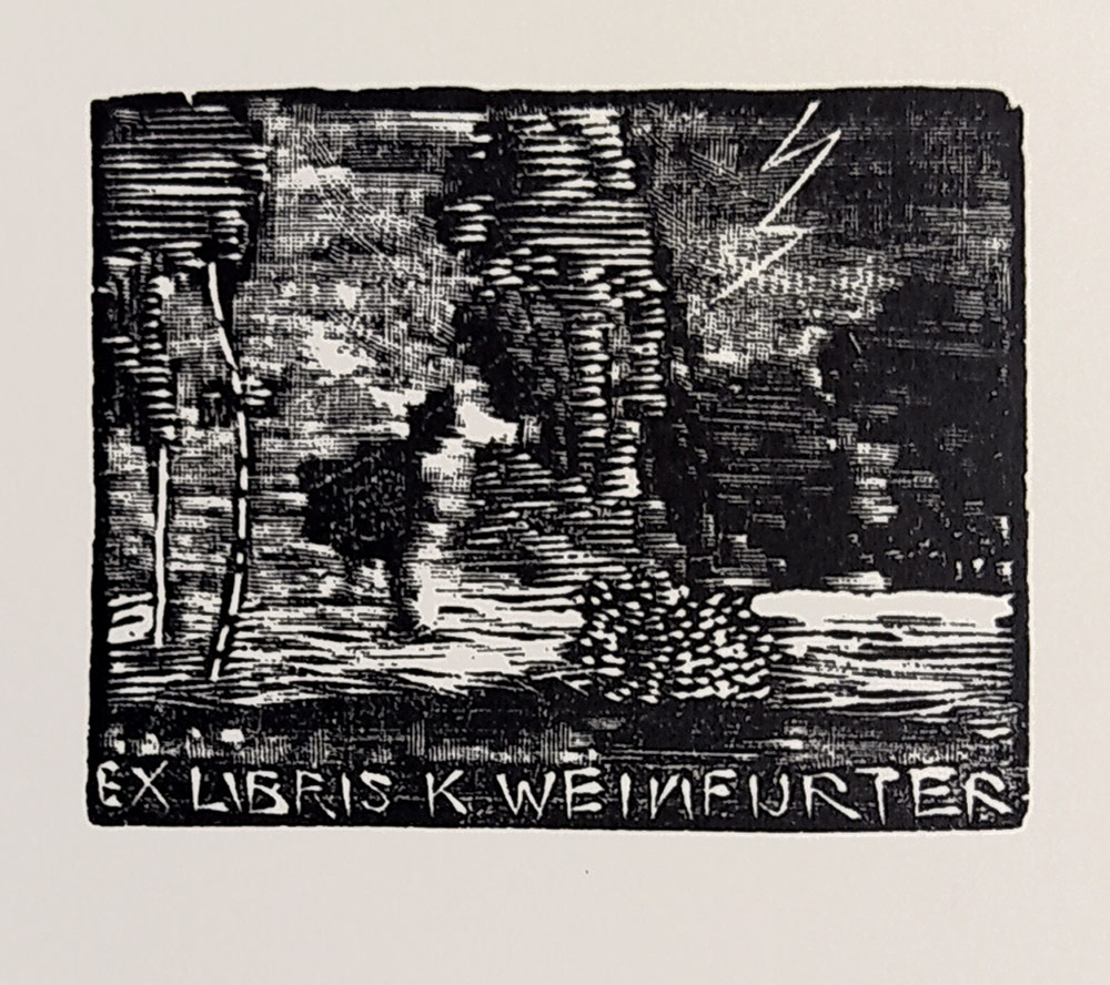 - Váchal Josef – Poutník v bouři, Ex libris K. Weinfurter, dřevoryt, 1911