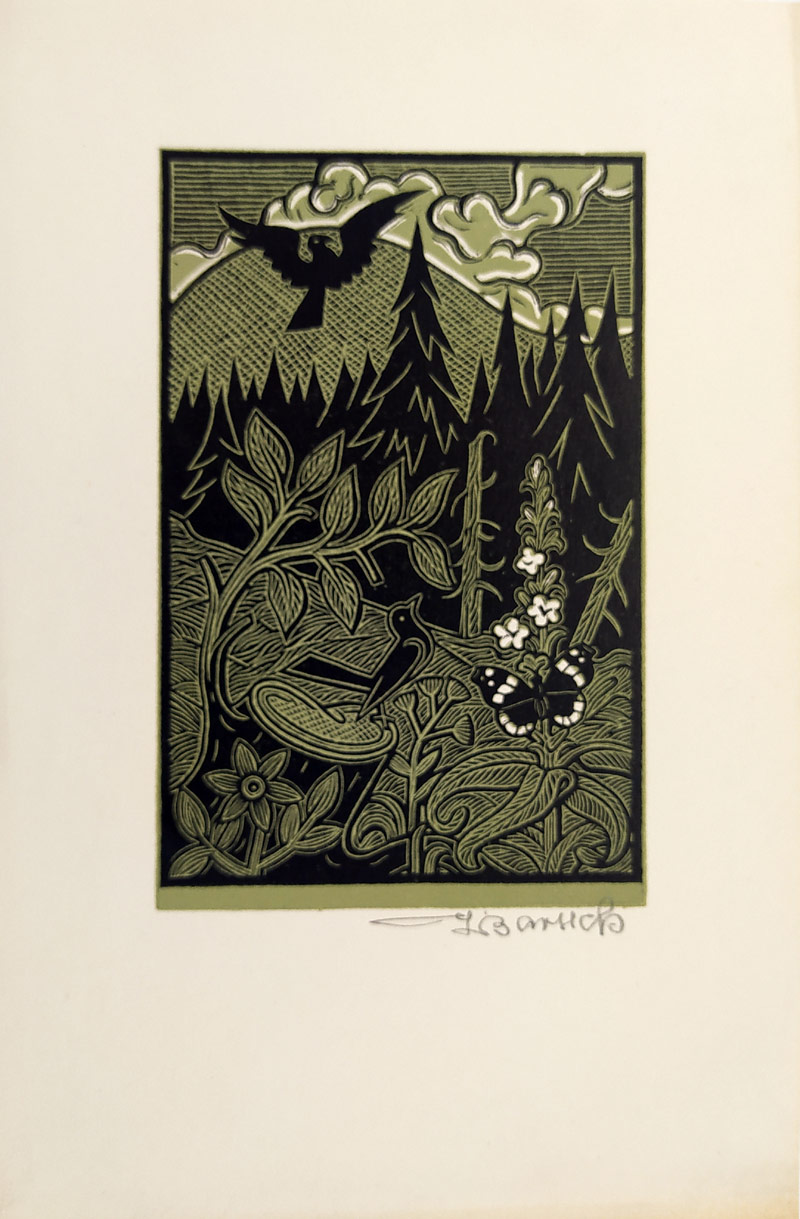 Baruch Jožka – Bez názvu, původní barevný dřevoryt, nedatováno. Celkový rozměr 24,0 cm × 15,6 cm.