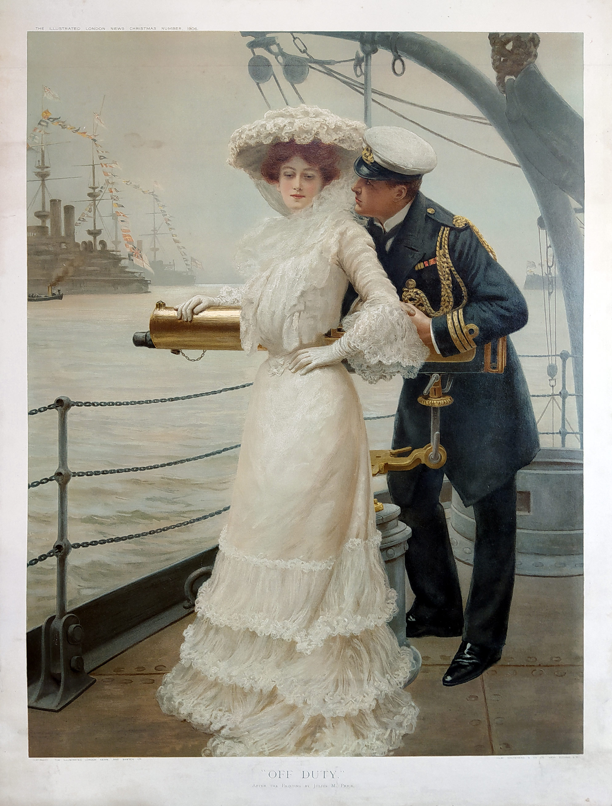 Price Julius Mendes – Off Duty, barevná chromolitografie, 1906. After the painting by Julius M. Price. Christmas Number Illustrated London News, 1906. Celkový rozměr: 70,7 cm × 53,8 cm.
