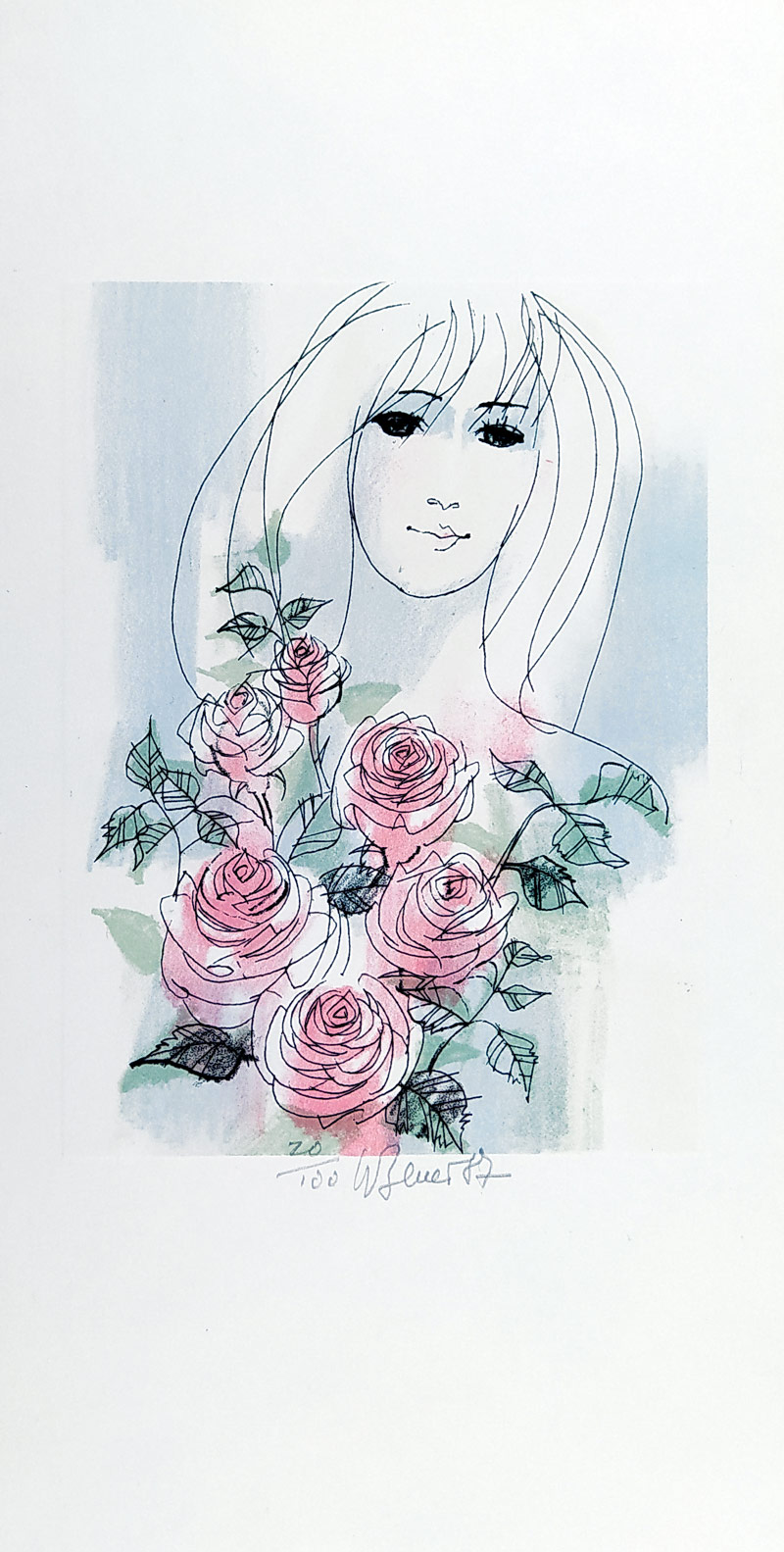 Beneš Karel – Dívka s růžemi, barevná litografie, prodej, 1987.