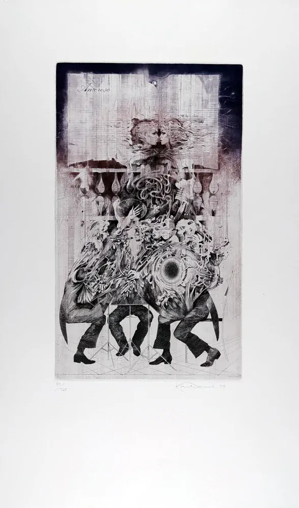 Demel Karel – Amoroso, původní barevný lept, číslováno 50/125, 1979. Signováno tužkou vpravo dole s datací. Celkový rozměr: 63,7 cm × 37,8 cm.