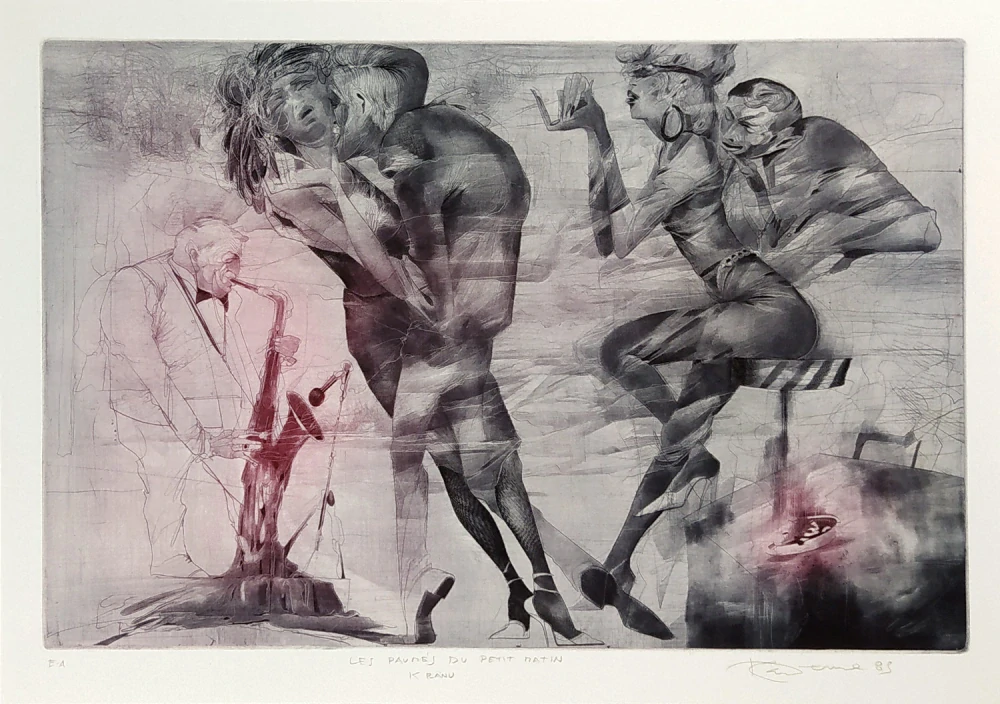 - Demel Karel – K ránu, rozměrný barevný lept a suchá jehla, autorský tisk, 1989