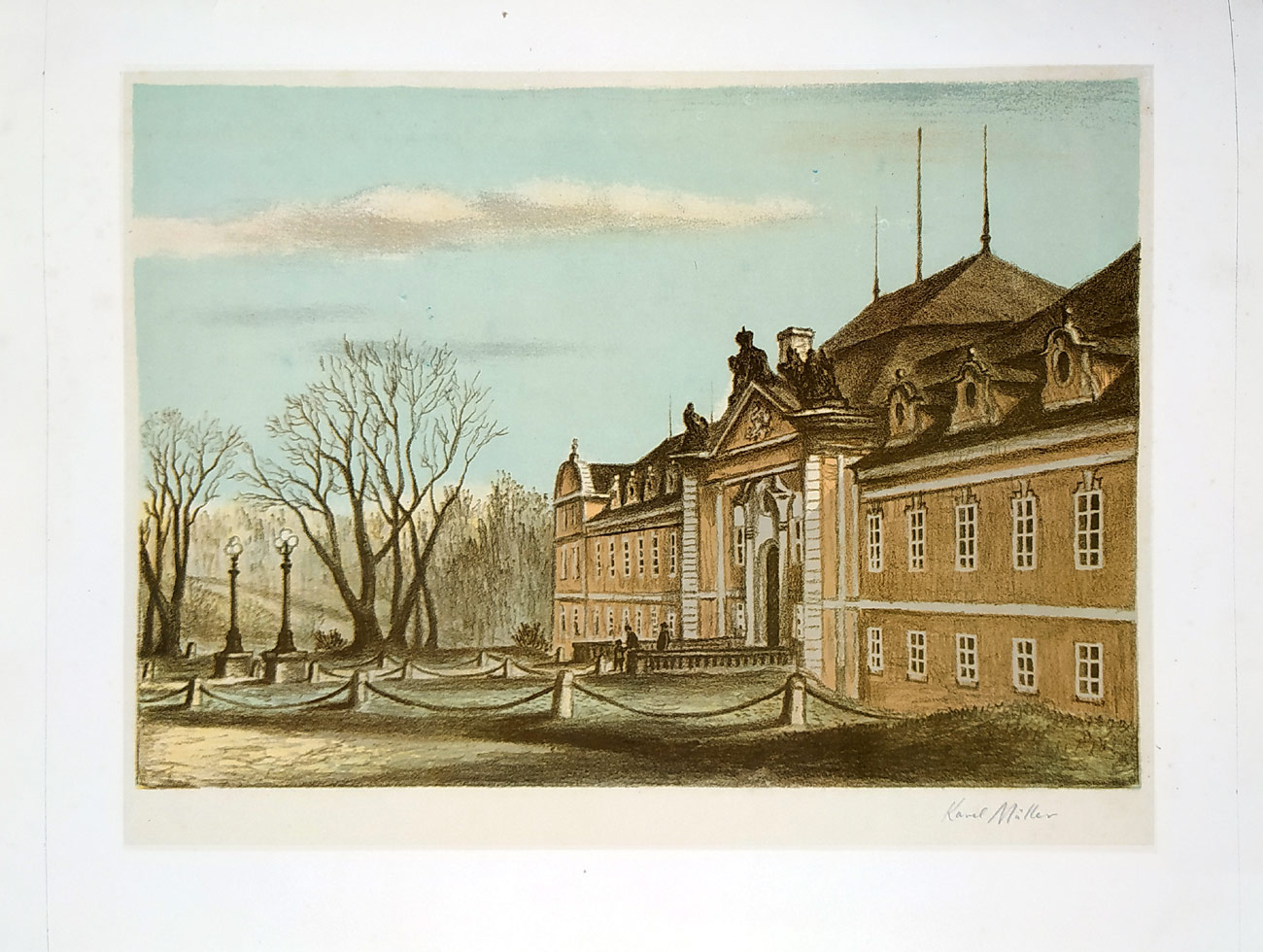 - Müller Karel – Zámek Dobříš, původní barevná litografie s podtiskem, ca 1940