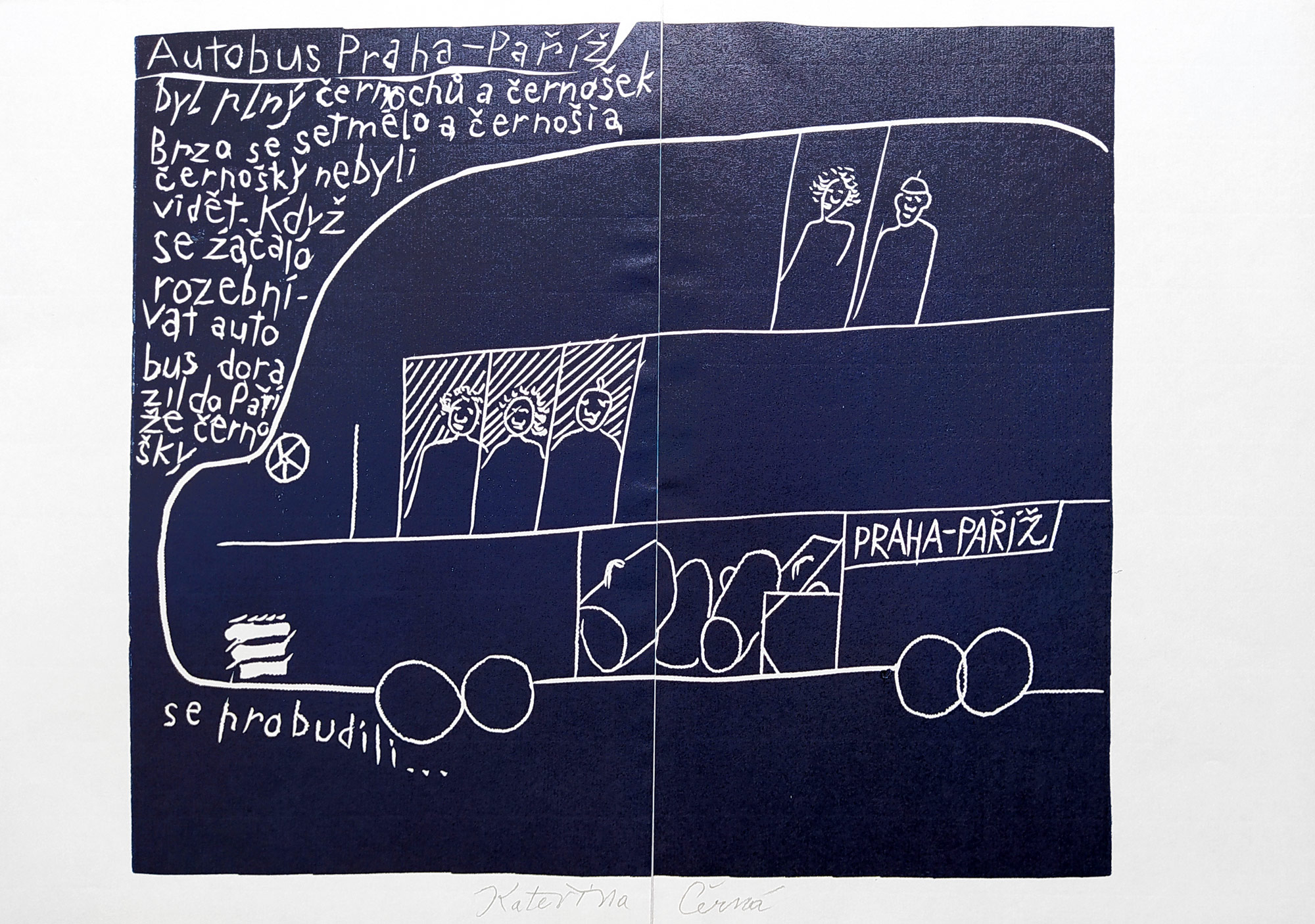 Černá Kateřina – Autobus Praha–Paříž, soulep 2 listů pro knihu „Viděla jsi černošky?“, barevný linoryt, 1995. Oceněno v soutěži o nejkrásnější knihu roku 1995. Z pozůstalosti autorky. Celkový rozměr: 34,9 cm × 49,6 cm.