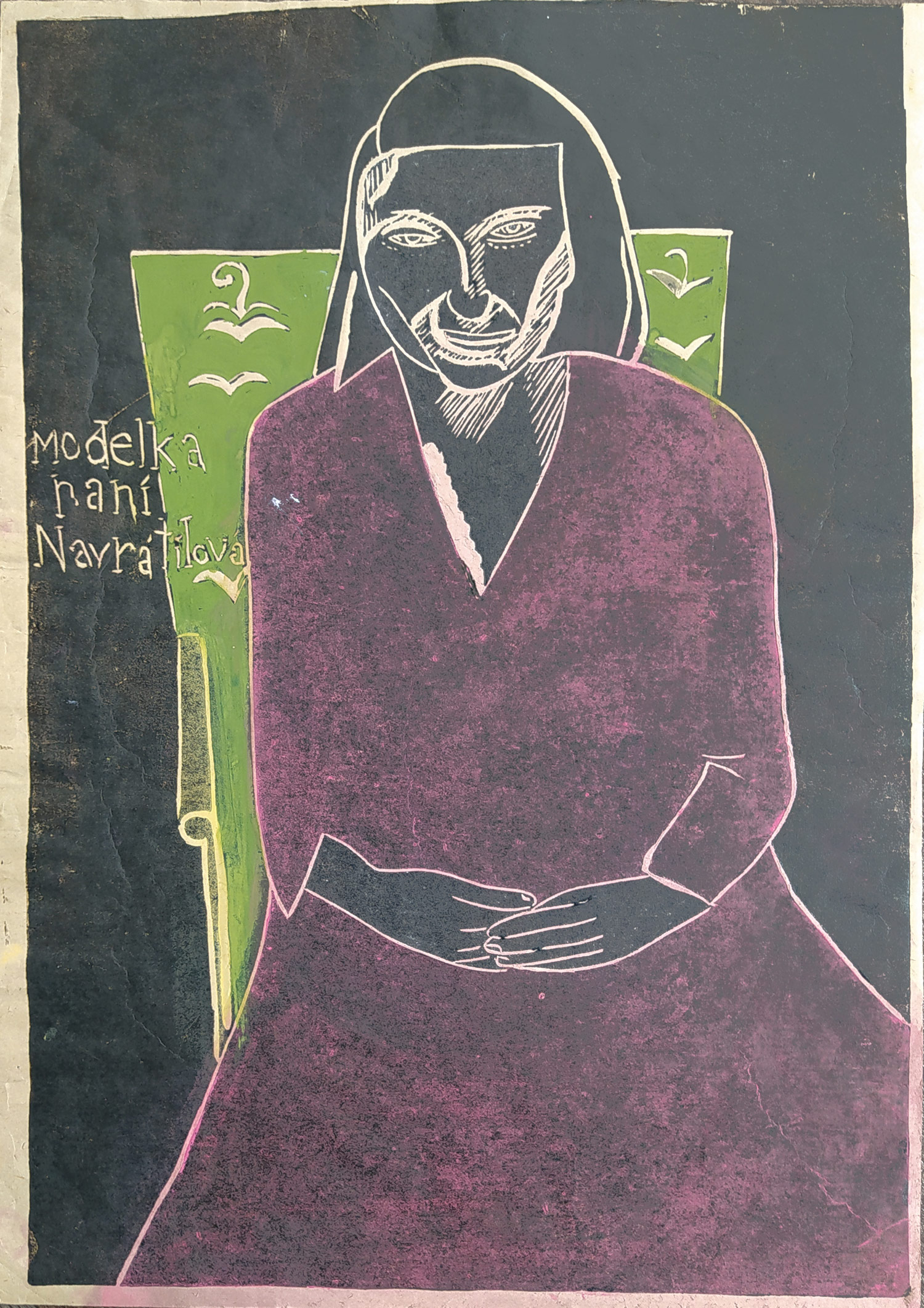 Černá Kateřina – Modelka paní Navrátilová, barevný linoryt, nedatováno. Z pozůstalosti autorky. Celkový rozměr: 49,4 cm × 35,1 cm.