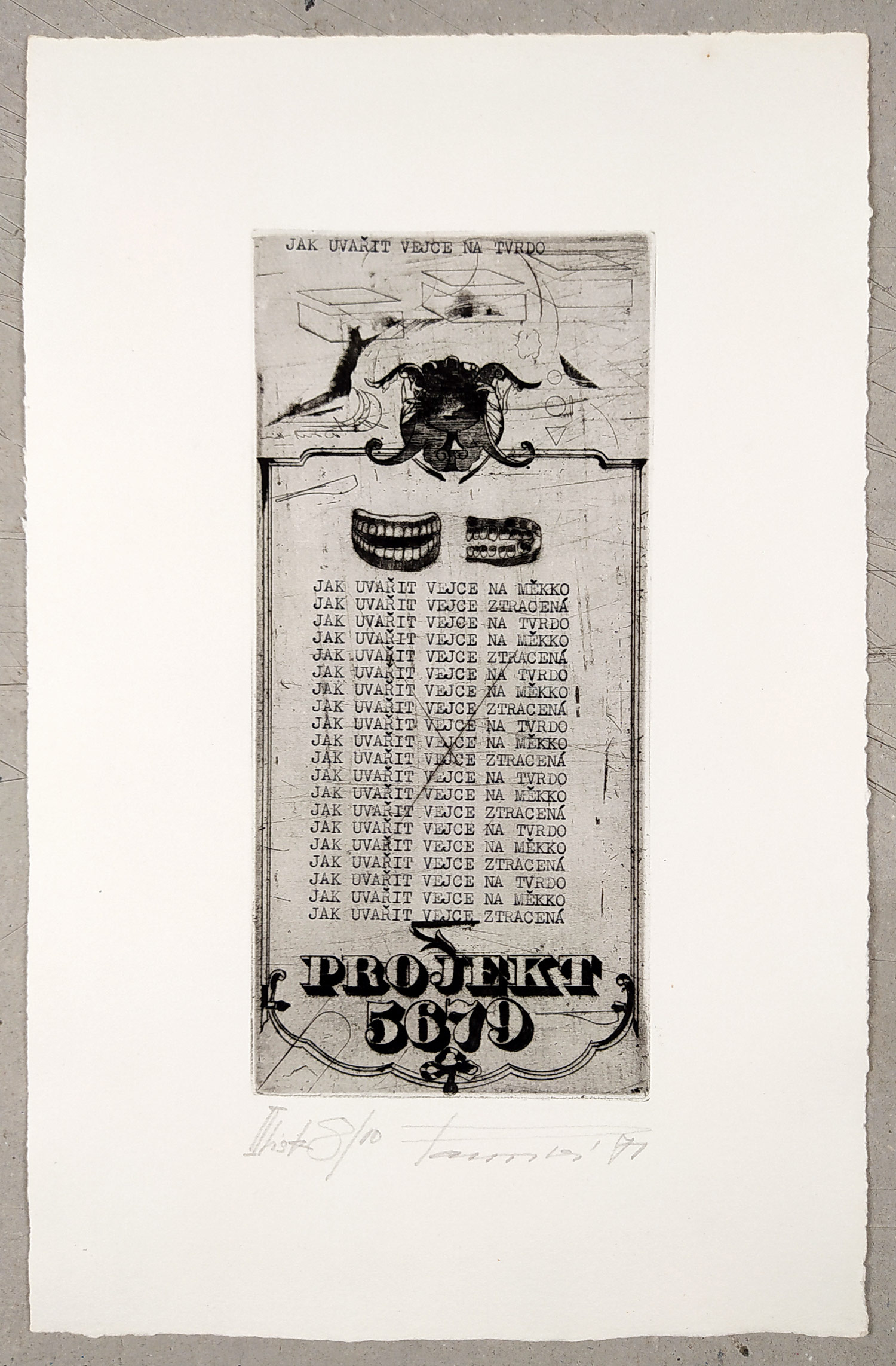 Pacovská Květa – Projekt 5679, kombinovaná technika, lept a suchá jehla, 1970. Autorský číslovaný tisk, značeno: II. tisk 8/10. Signováno a datováno tužkou uprostřed dole.