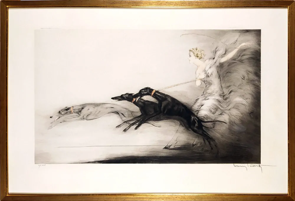 Icart Louis J. L. – Vitesse, suchá jehla s kolorovaným leptem a barevnou akvatintou, 1927. Signováno tužkou vpravo dole. Celkový rozměr s rámem: 55,2 cm × 81,6 cm.
