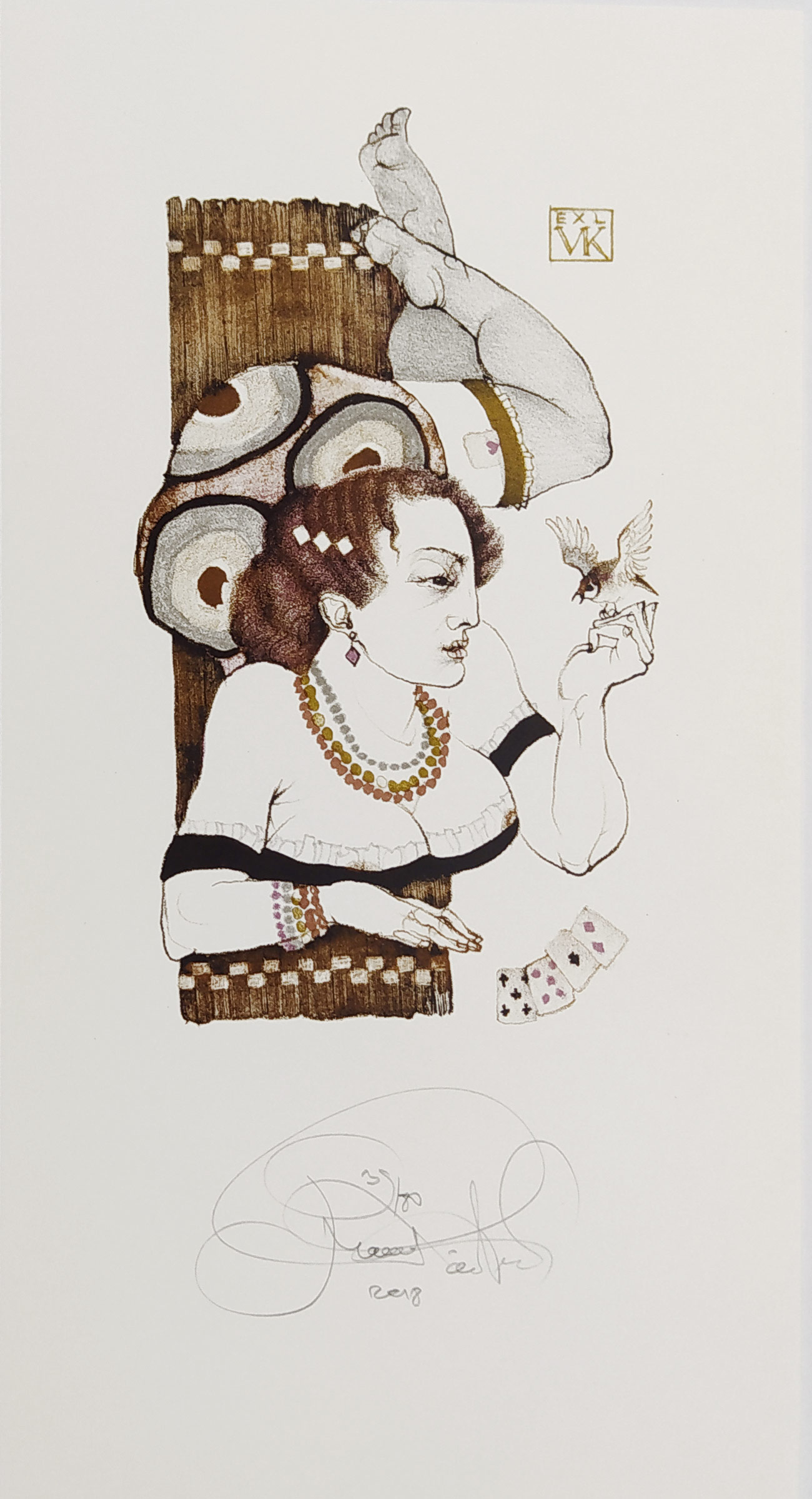 - Richterová Marina – Dáma s ptáčkem, Ex libris VK, barevná litografie, 2018