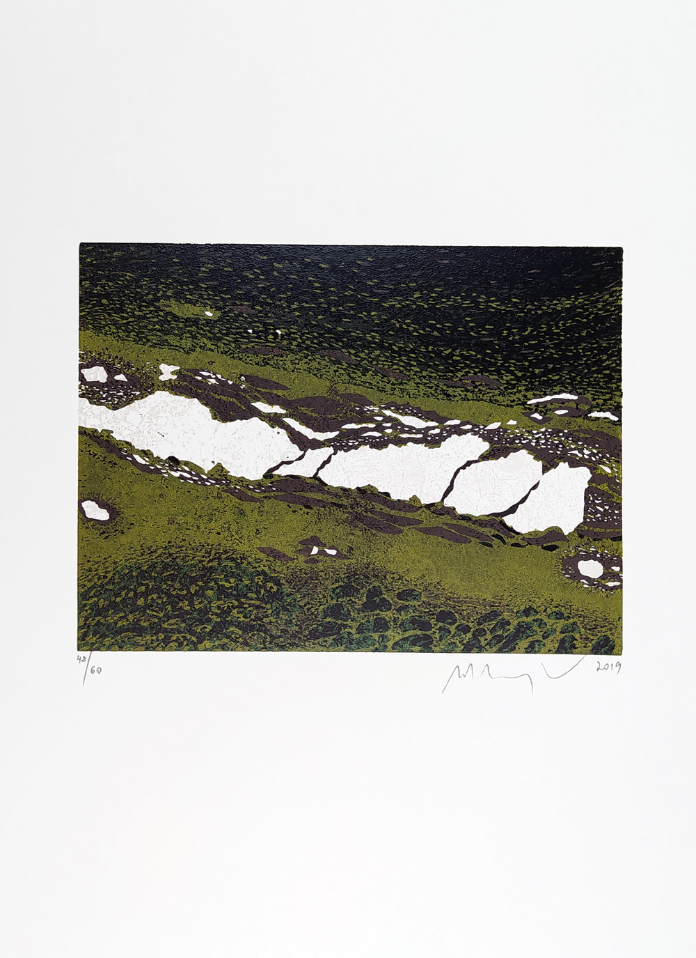 Manojlín Martin – Teplá River I., linoryt a kombinovaná technika, číslovaný exemplář 48/60, r. 2019. Celkový rozměr: 29,6 cm × 20,9 cm.