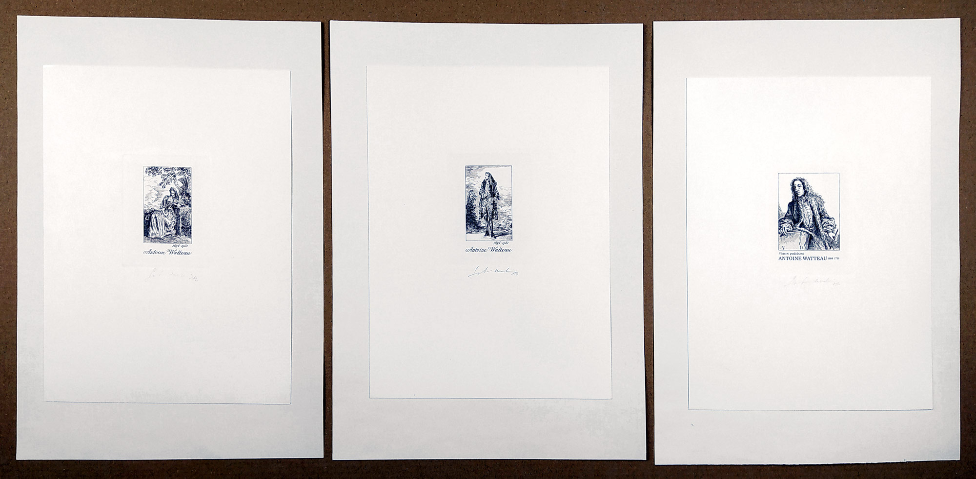 Srb Martin, Watteau Antoine – Dobové kostýmy ze starých rytin, tři původní oceloryty, 1984. Oceloryty podle Antoine Watteau. Signováno tužkou uprostřed dole s datací.