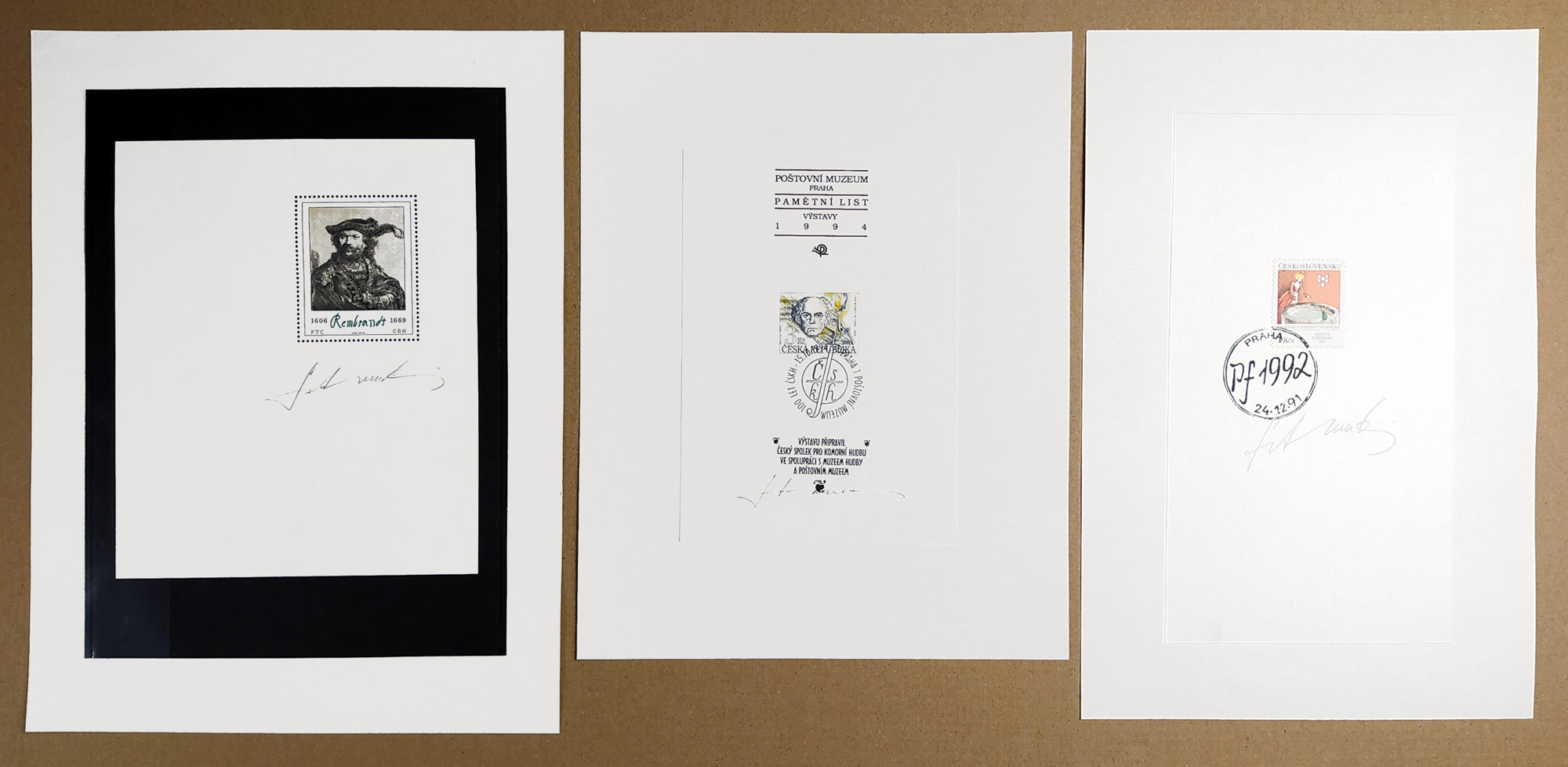 Srb Martin – Konvolut tří známek, pamětní list, PF a známkový arch, 1991–1994. Signováno tužkou uprostřed dole.