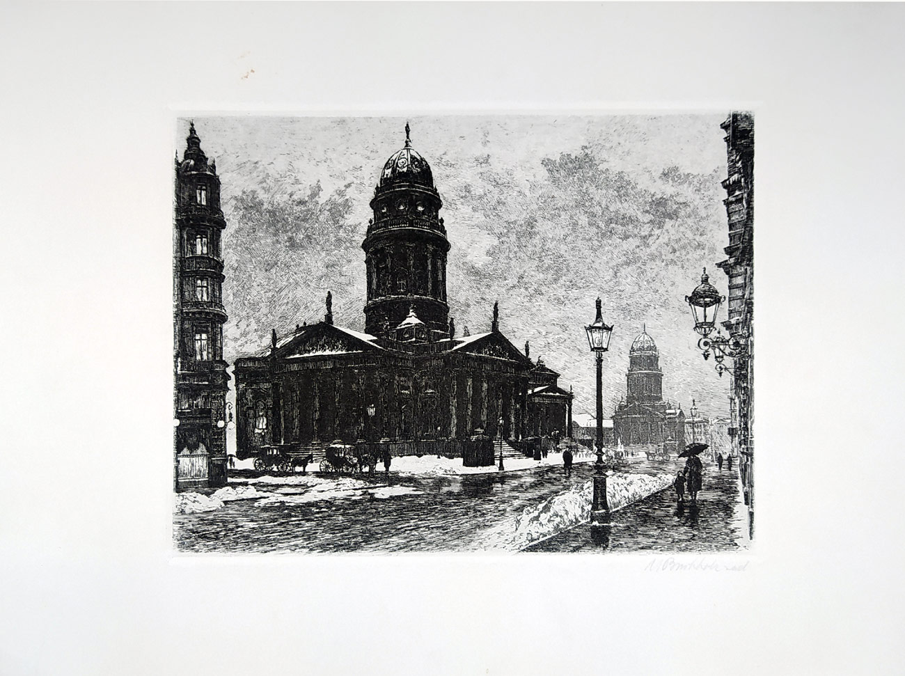Buchholz Max – Berlín Gendamenmarkt, Deutscher Dom a Francösischer Dom, původní lept, ca 1920. Celkový rozměr v rámu: 29,8 cm × 40,0 cm.