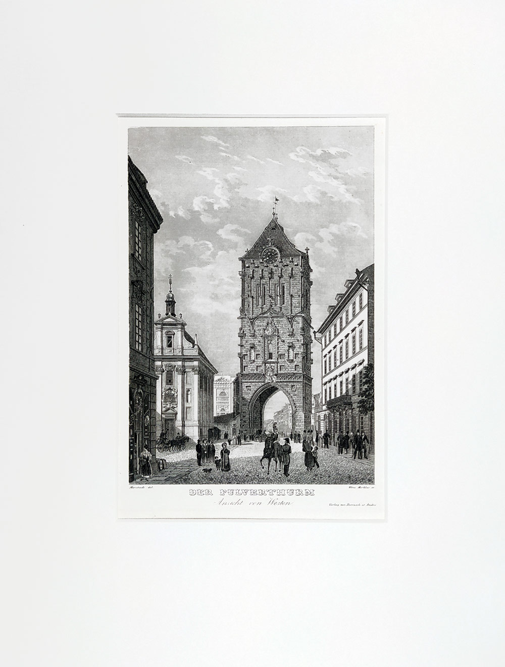 Praha – Prašná brána od západu. „Der Pulverthurm. Ansicht von Westen.“ Předleptaný oceloryt podle kresebné předlohy V. Morstadta leptal V. Merklas.