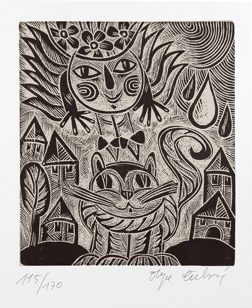 Čechová Olga – Kočičino překvapení, P. F. 1979 Josef Marek, dřevoryt, 1979