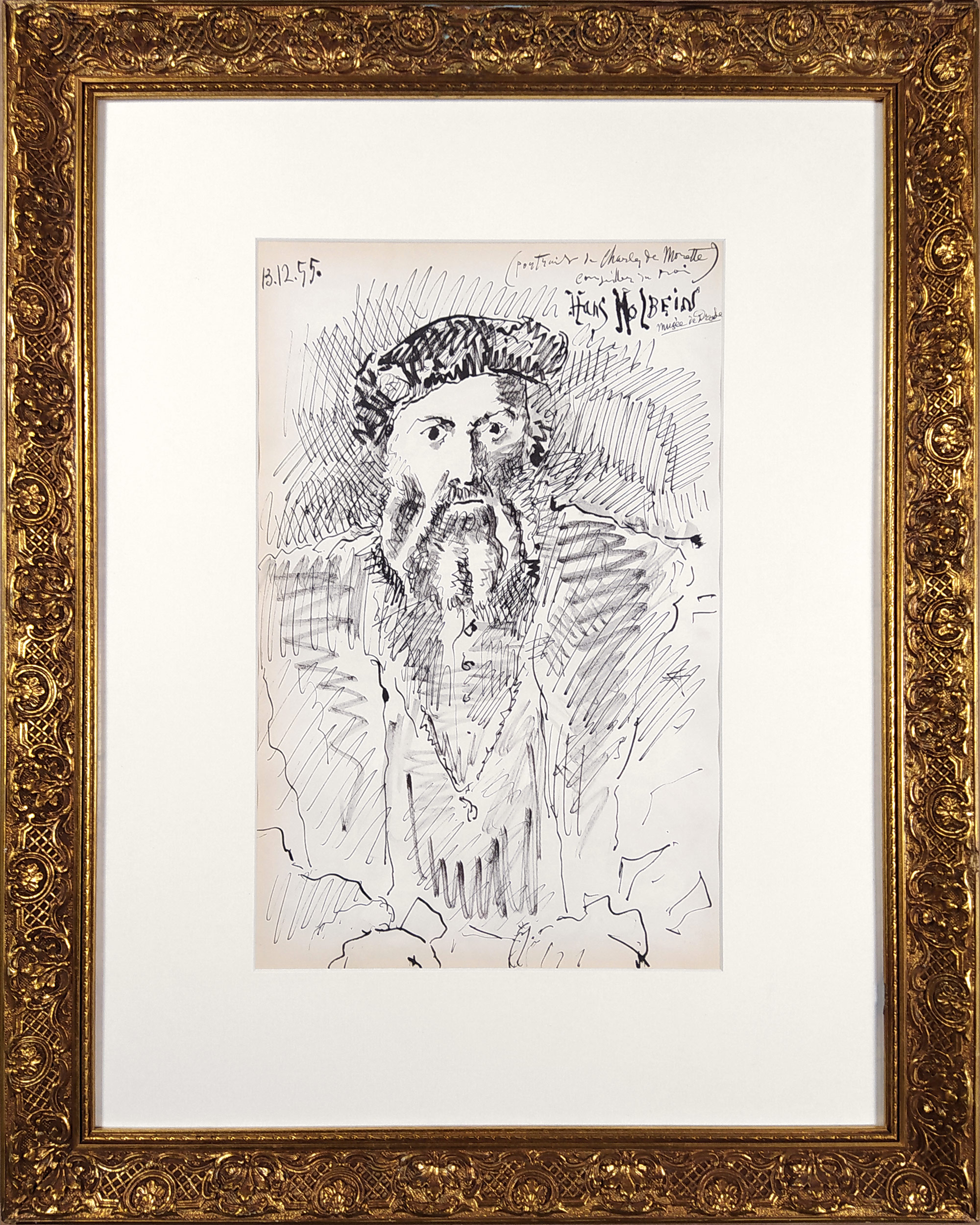 Picasso Pablo – Hans Holbein, Musée de Prado, 13. 12. 1955, původní litografie, 1955. Nesignovaná a nečíslovaná litografie. Celkový rozměr v rámu: 66,2 cm × 52,5 cm.