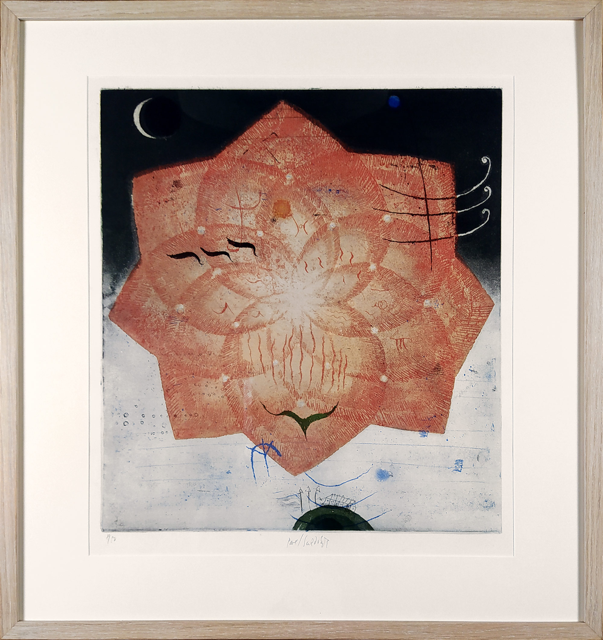 Sukdolák Pavel – Hvězda, barevný lept, č. 8/50, velkoformátová grafika, nedatováno. Signováno tužkou uprostřed dole. Celkový rozměr s rámem: 77,8 cm × 73,0 cm. Cena bez rámu 12 000 Kč, s rámem 14 000 Kč.