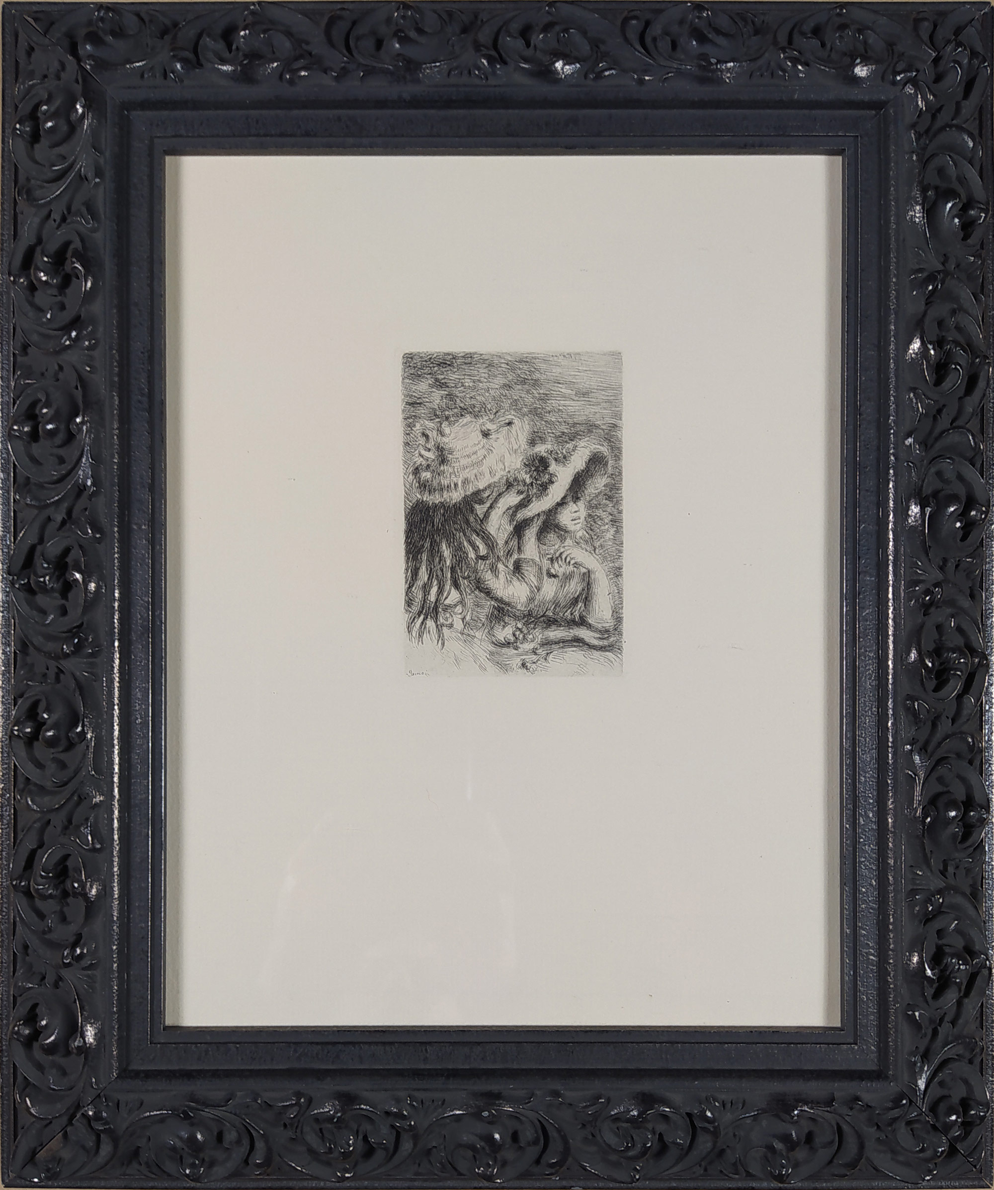Renoir Pierre-Auguste – Le Chapeau épinglé, lept a suchá jehla na papíře, 1894. Signováno typograficky v desce vlevo dole. Celkový rozměr s rámem: 43,0 cm × 36,5 cm.