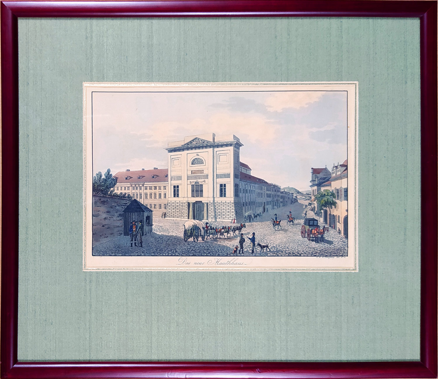 Praha – Dům U Hybernů, „Das neue Mauthhaus“, L. A. Buquoy, staře kolorovaná akvatinta, 1820. Signováno typograficky vpravo dole L. E. G. Buquoy del. et sc. Celkový rozměr v rámu 36,5 cm × 42,5 cm.