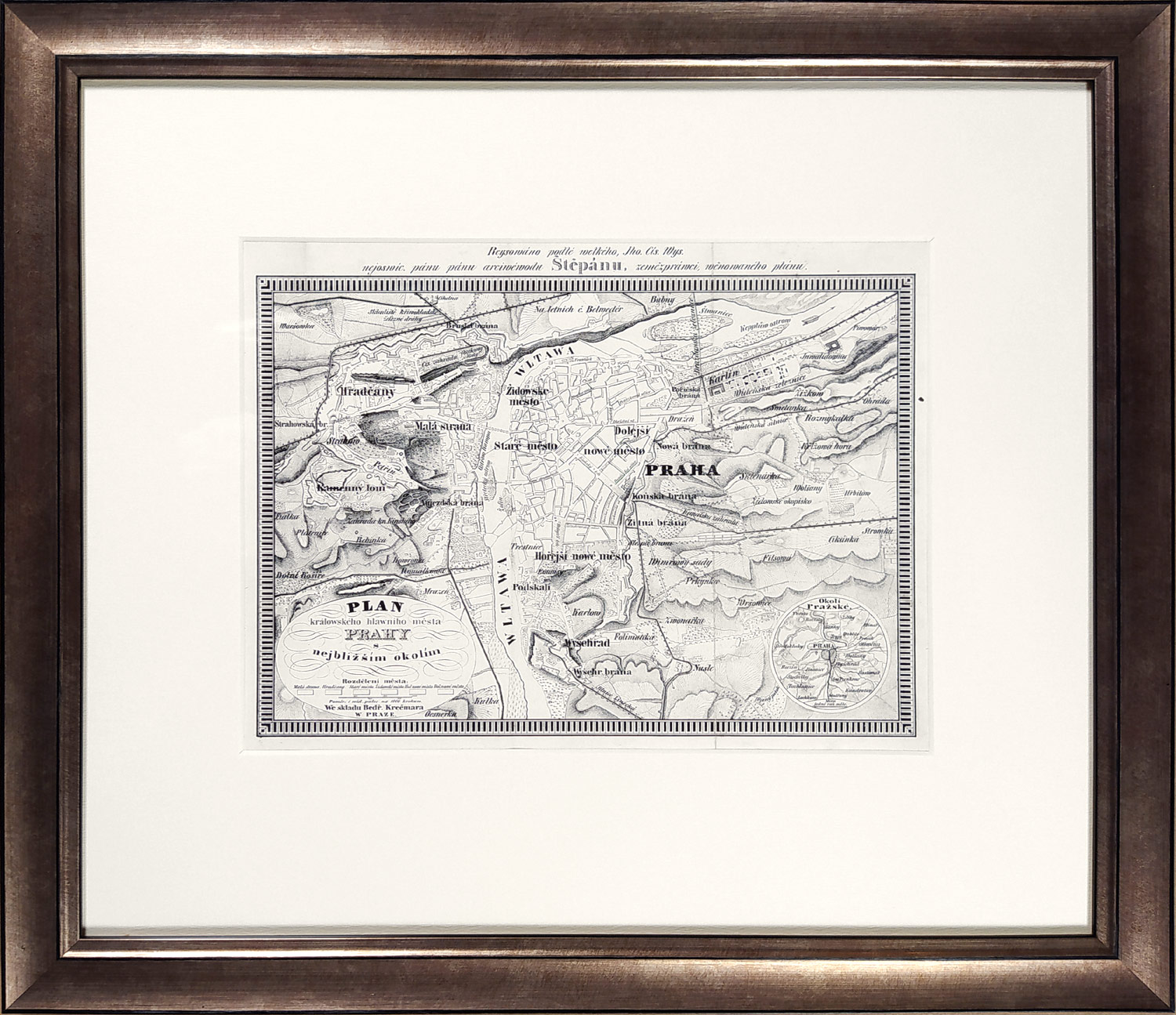 Praha – plán města „Plan králowského hlawního města Prahy s nejbližším okolím“. Původní oceloryt, 1852, vydal F. Kretzschmar v Praze. Celkový rozměr v paspartě a rámu 35,0 cm × 58,0 cm.