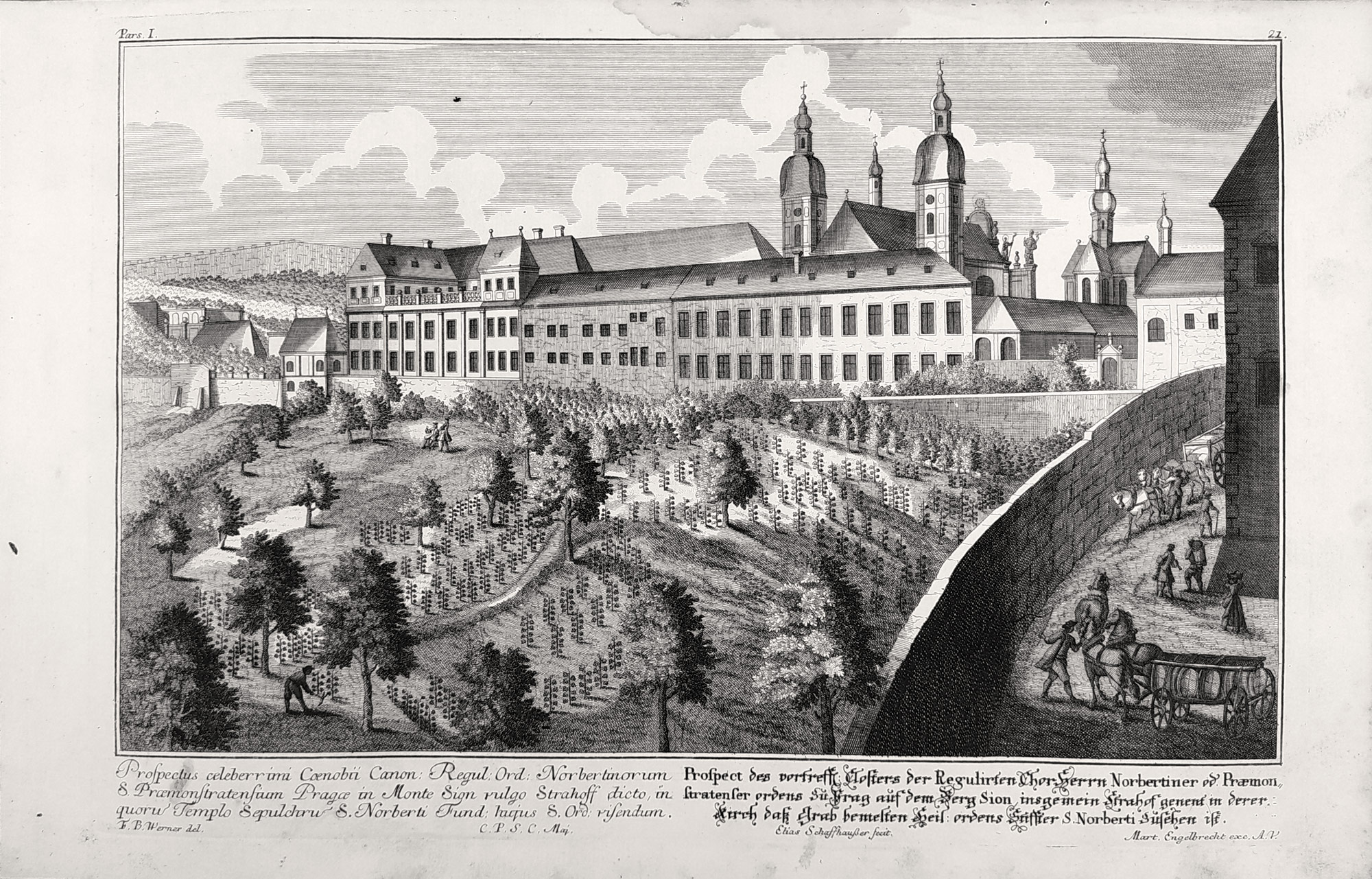 Praha – Strahovský klášter. Původní mědiryt podle kresby F.B. Wernera vyryl Schafthaußer, Elias. Vydal M. Engelbrecht kolem 1740. Název listu pod vyobrazením latinsky a německy Pars I./21. „Prospect des vortreffl. Closters der Regulirten Chor Herrn Norbertiner od. Praemonstratenser ordens zu Prag auf der Berg Sion, insgemein Strahof genent in derer Kirch daß Grab bemesten Heil. ordens Stiffter S. Norberti zu sehen ist“.