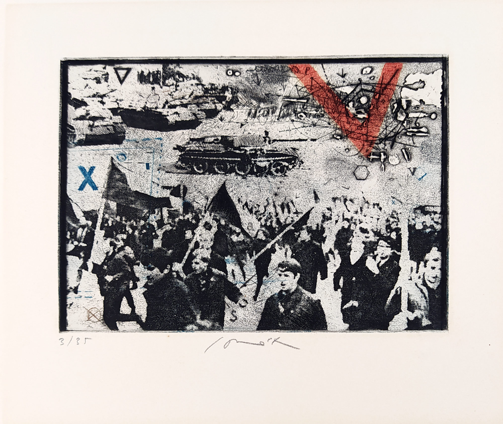 Sovák Pravoslav – 21. srpen 1968, původní lept a vernis mou, 1968. Signováno tužkou uprostřed dole. Celkový rozměr: 44,7 cm × 34,8 cm.