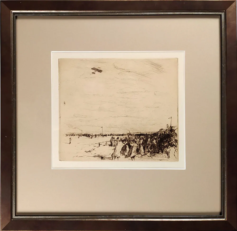 František Tavík Šimon – Dvouplošník, První let letadla v Paříži, původní lept, 1909, signováno v desce TFŠ. Vydalo nakladatelství Gesellschaft für vervielfältigende Kunst ve Vídni. Celkový rozměr v rámu: 35,5 cm × 36,5 cm.