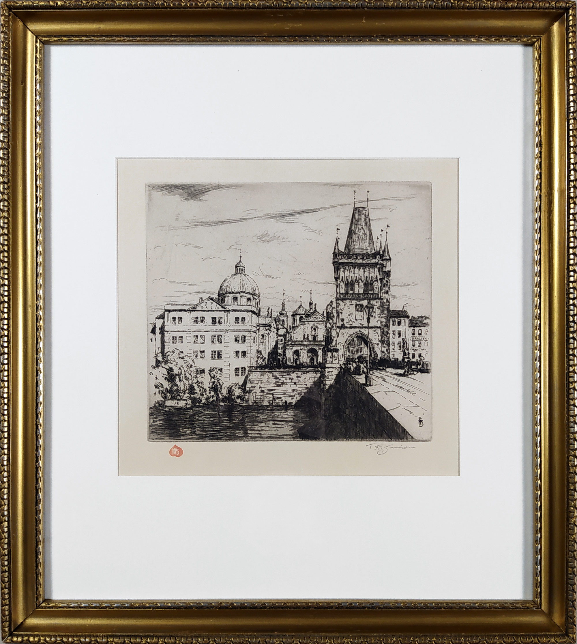 Šimon Tavík František – Staroměstská mostecká věž a Klášter křížovníků s červenou hvězdou, původní lept, 1911. Grafický list je uveden v Soupisu grafického díla T. F. Šimona od Arthura Nováka pod číslem 139c. Vytištěno bylo 250 exemplářů. Vydal Jan Štenc. Celkový rozměr v rámu: 47,8 cm × 42,3 cm.