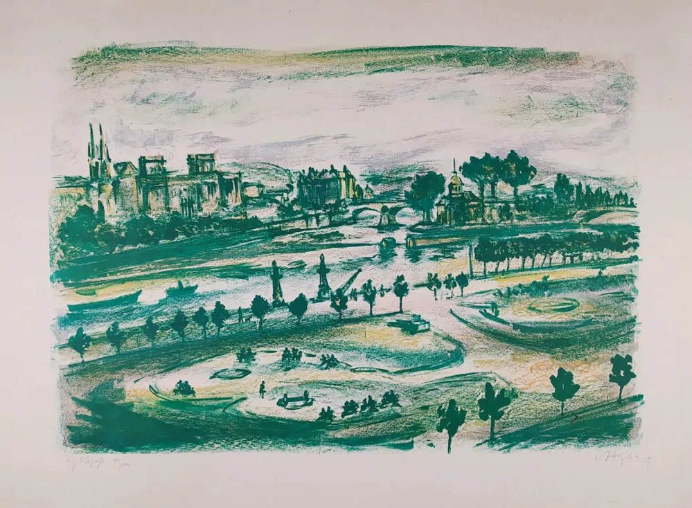 Hejna Václav – Nábřeží na jaře, barevná litografie, 1959. Celkový rozměr: 49,5 cm × 66,5 cm.