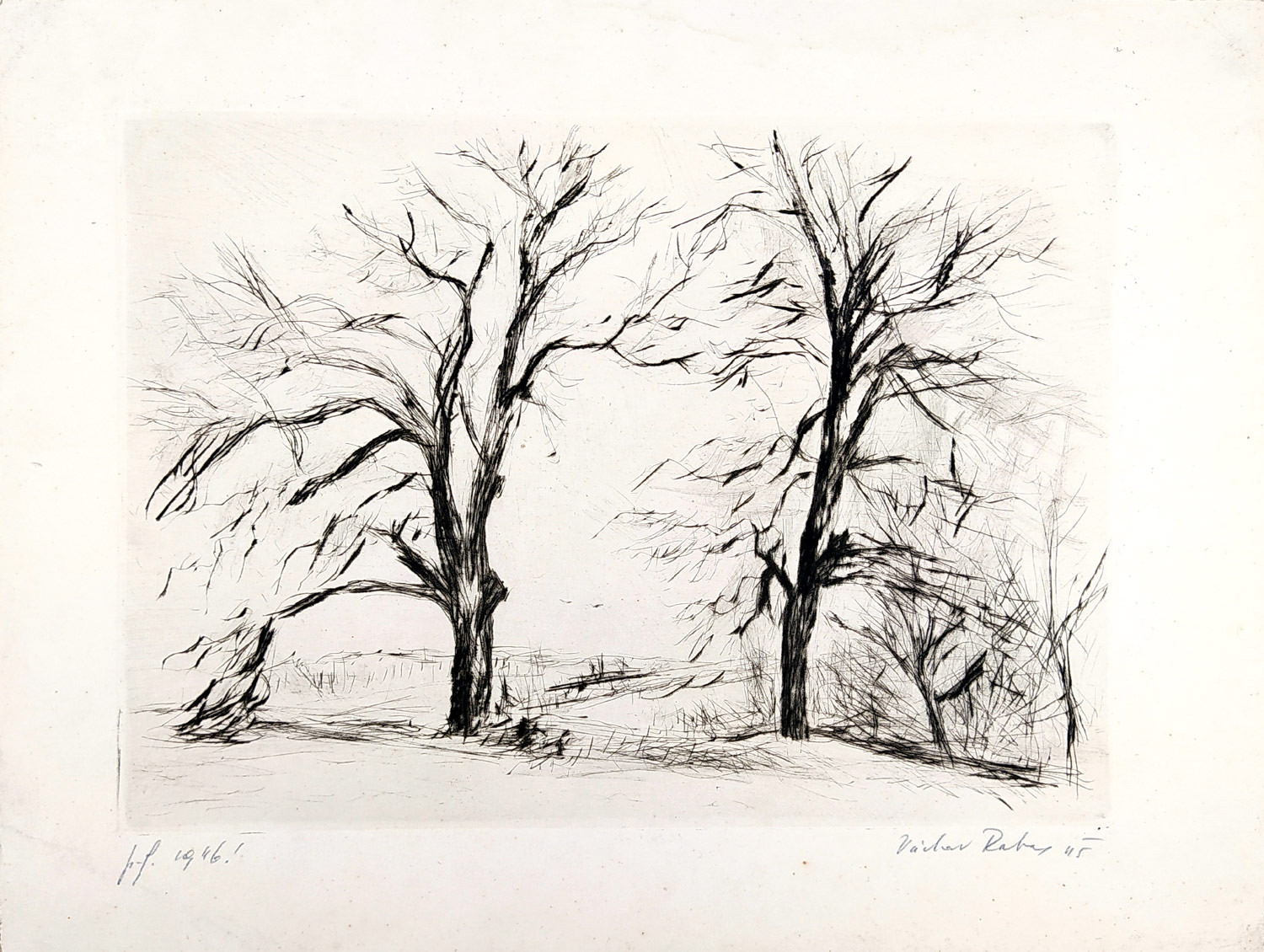 Rabas Václav – PF 1946, původní lept, 1945. Signováno tužkou vpravo dole s datací. Celkový rozměr: 24,1 cm × 31,5 cm.