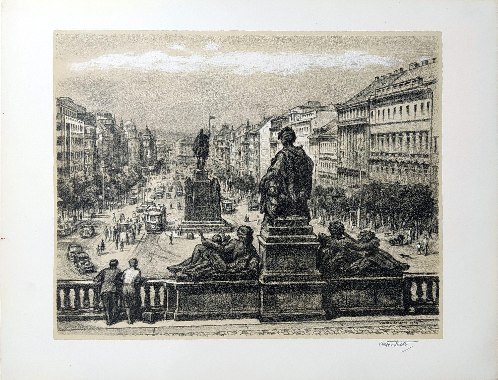 Stretti Viktor – Praha, Václavské náměstí, původní litografie s podtiskem, 1949. Signováno tužkou vpravo dole. Celkový rozměr: 38,1 cm × 50,1 cm.