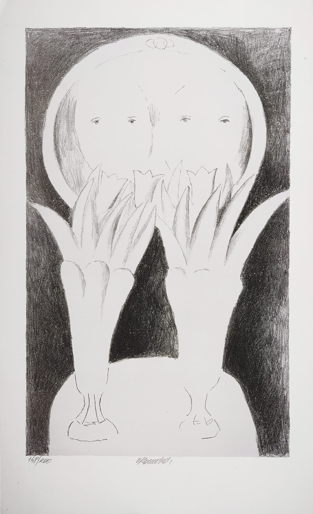 Komárek Vladimír – Vzpomínka, původní dřevoryt s barevným podtiskem, číslováno 148/200, nedatováno. Celkový rozměr: 53,5 cm × 32,4 cm.