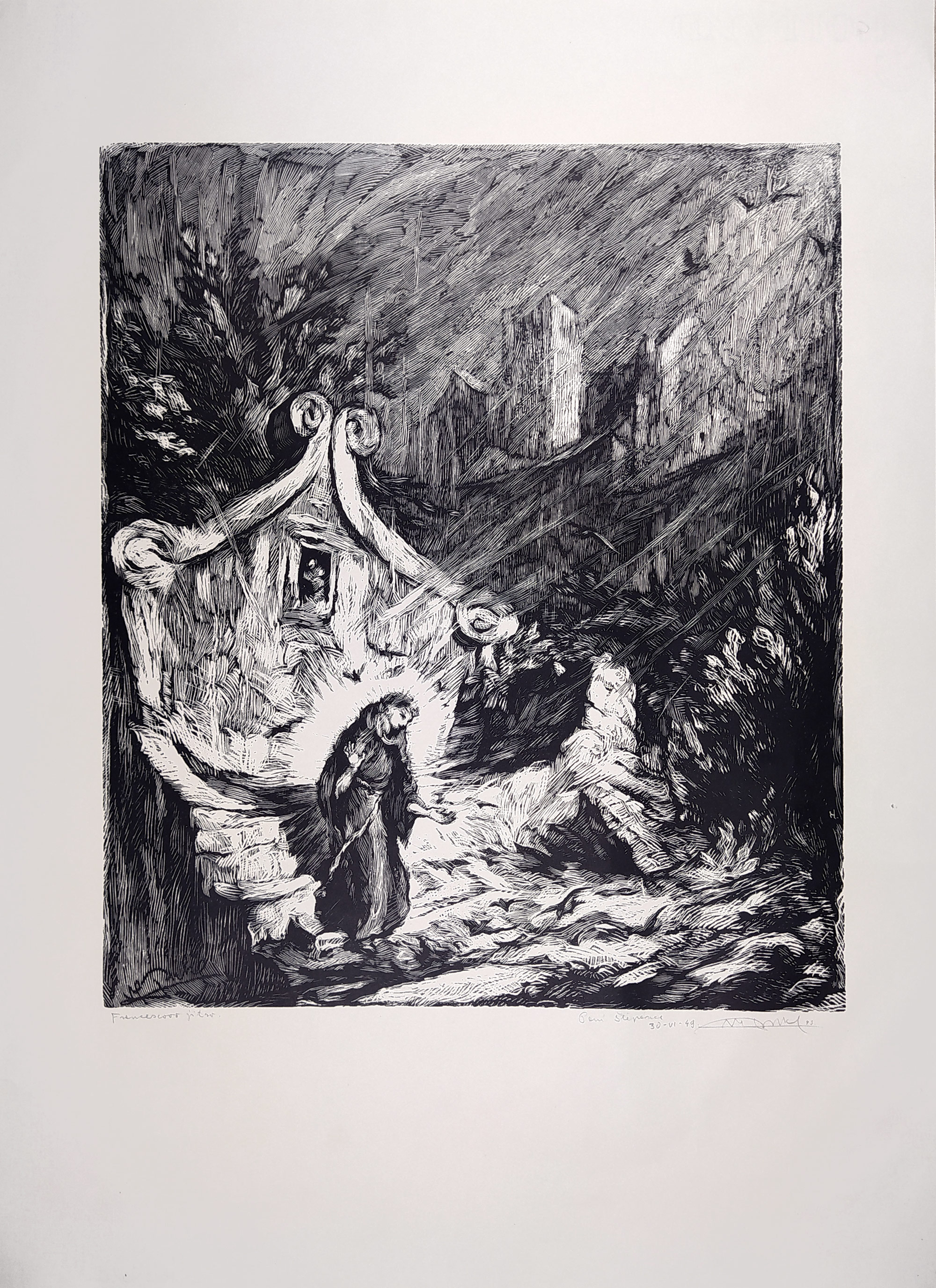 Pukl Vladimír – Francescovo jitro, původní dřevoryt, dedikace autora, 1943. Tištěno na papíře Pannekoek Holland. Signováno tužkou vpravo dole s datací. Celkový rozměr: 60,5 cm × 51,5 cm.