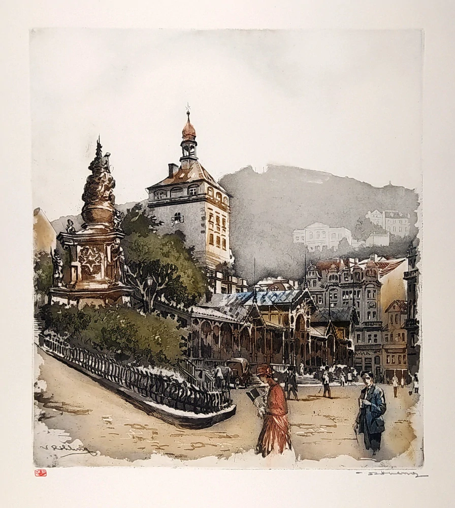 Röhling Vladislav – Zámecká věž a kolonáda v Karlových Varech, barevný lept, ca 1920–1930Prodáno3 600 Kč/ ks