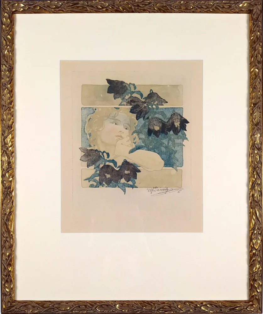 Preissig Vojtěch – Dívka s květy, barevná akvatinta, 1905. Signováno tužkou vpravo dole s datací. Celkový rozměr s rámem: 54,5 cm × 45,5 cm.