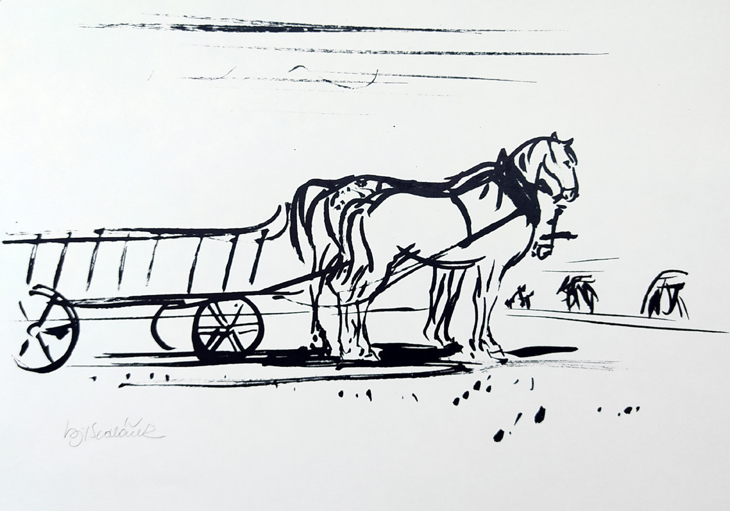 - Sedláček Vojtěch – Koňský povoz se žebřiňákem, původní signovaná litografie, ca 1950