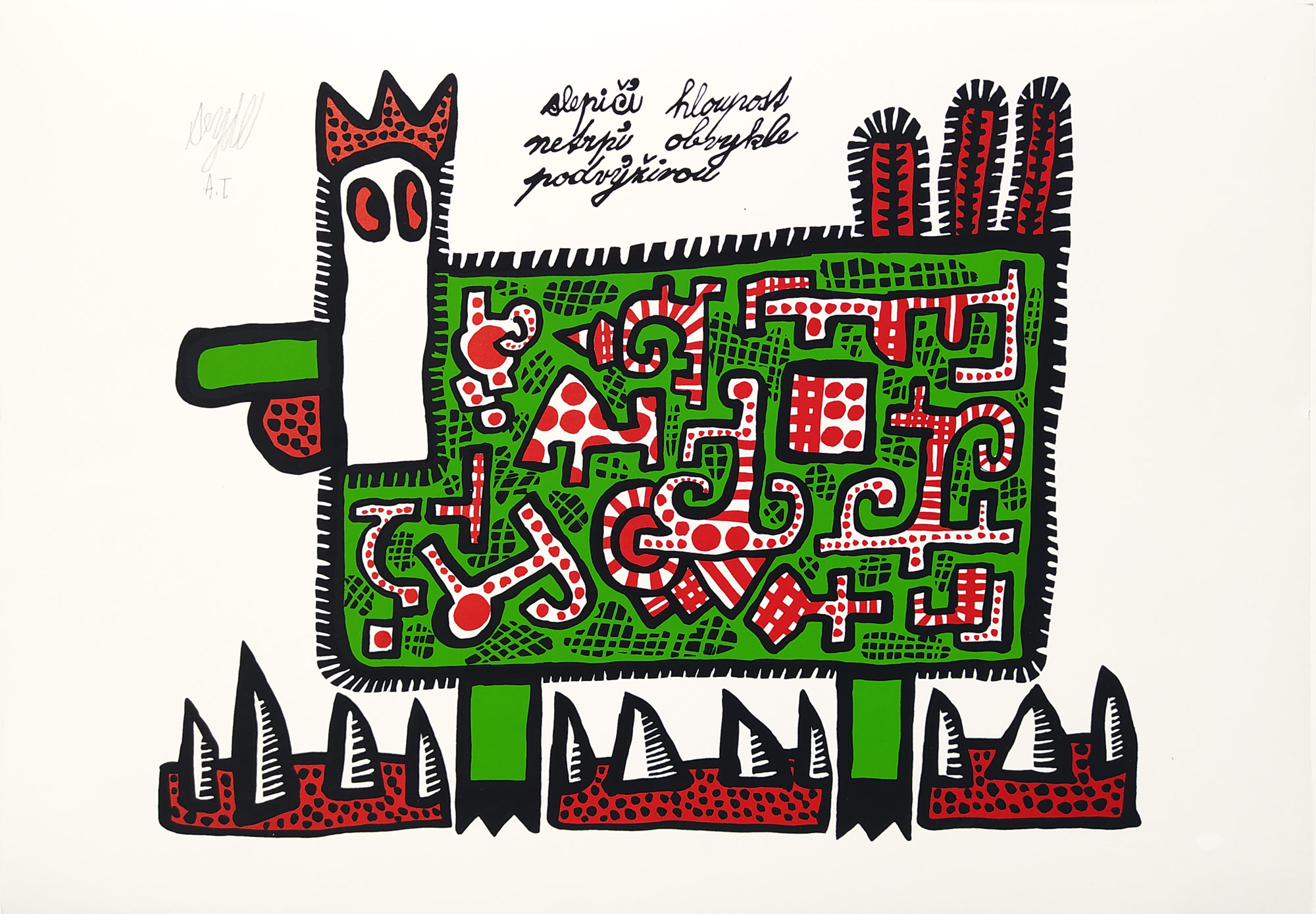 Seydl Zdenek – Slepice, signovaná barevná serigrafie, autorský tisk, ca 1970. Slepičí hloupost netrpí obvykle podvýživou. Celkový rozměr: 35,2 cm × 49,9 cm.