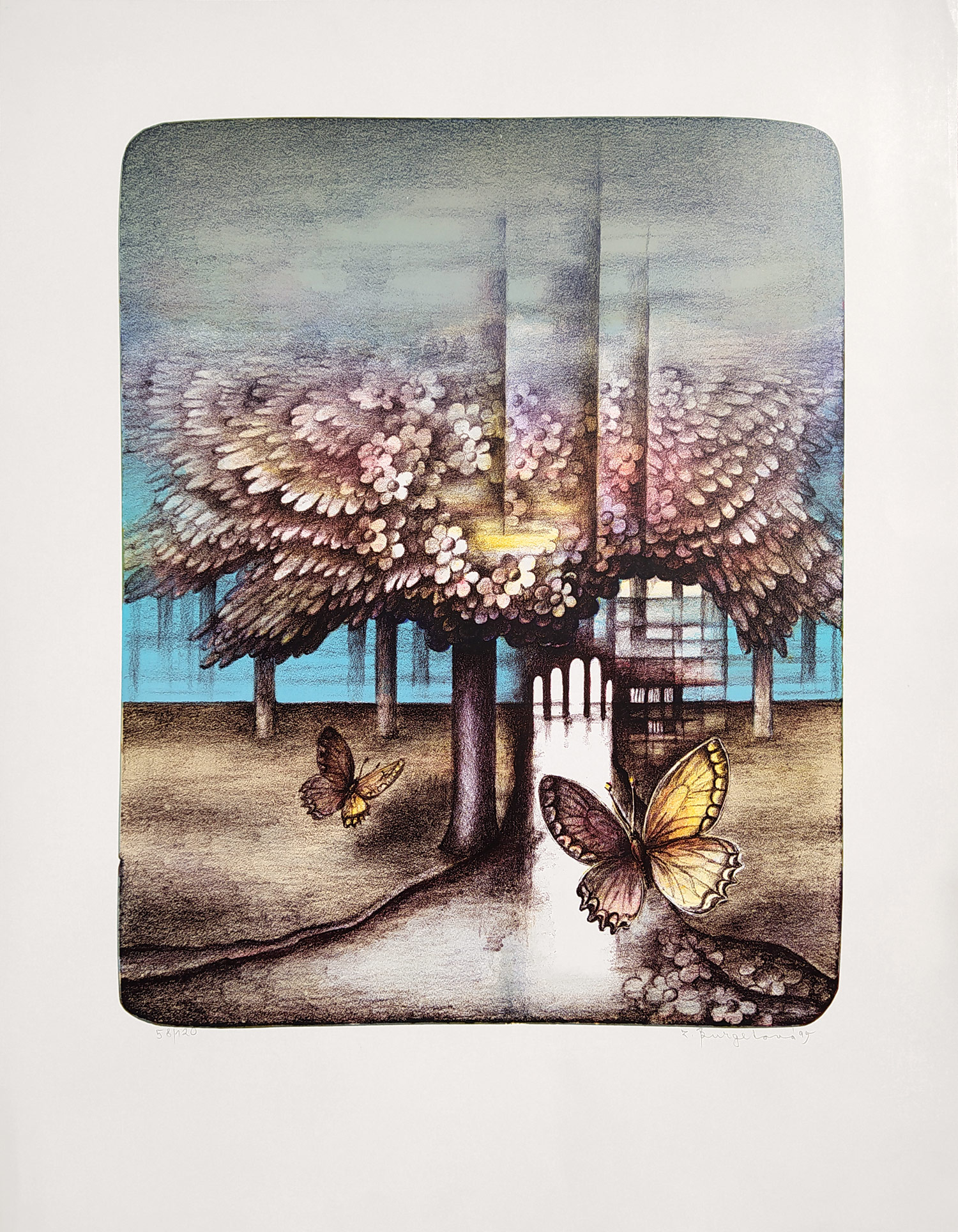 Burgetová Zdeňka – Radostná cesta, signovaná barevná litografie, číslováno 58/100, 1995. Signováno tužkou vpravo dole s datací. Celkový rozměr: 41,4 cm × 32,6 cm.