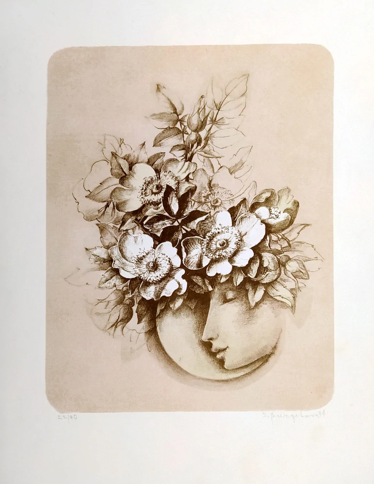 Burgetová Zdeňka – Snění, barevná litografie s podtiskem, č. 22/90, 1991. Signováno tužkou vpravo dole s datací. Celkový rozměr 30 cm × 23 cm.