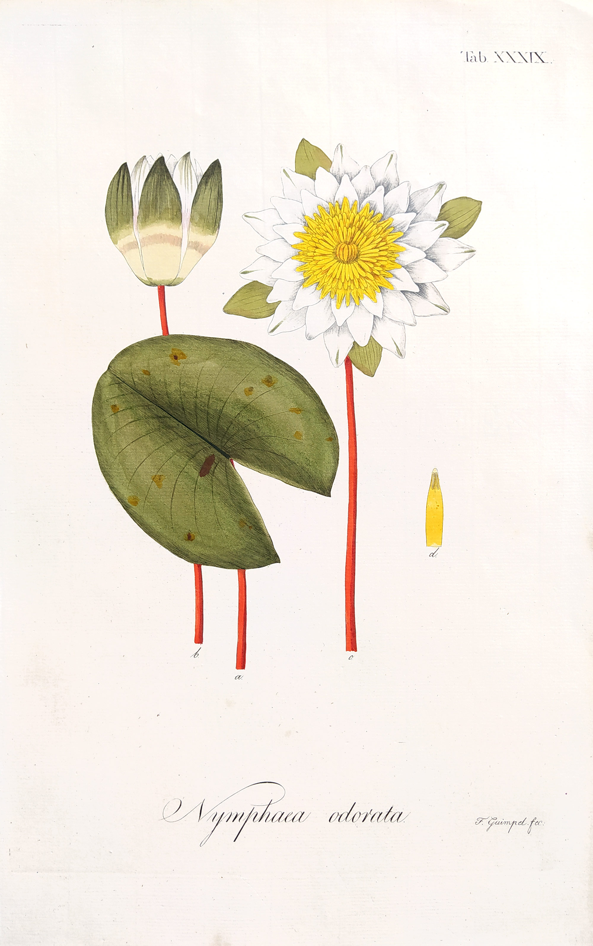 Guimpel Friedrich – Leknín vonný, Nymphaea odorata, staře kolorovaný původní mědiryt, 1838skladem3 200 Kč/ ks