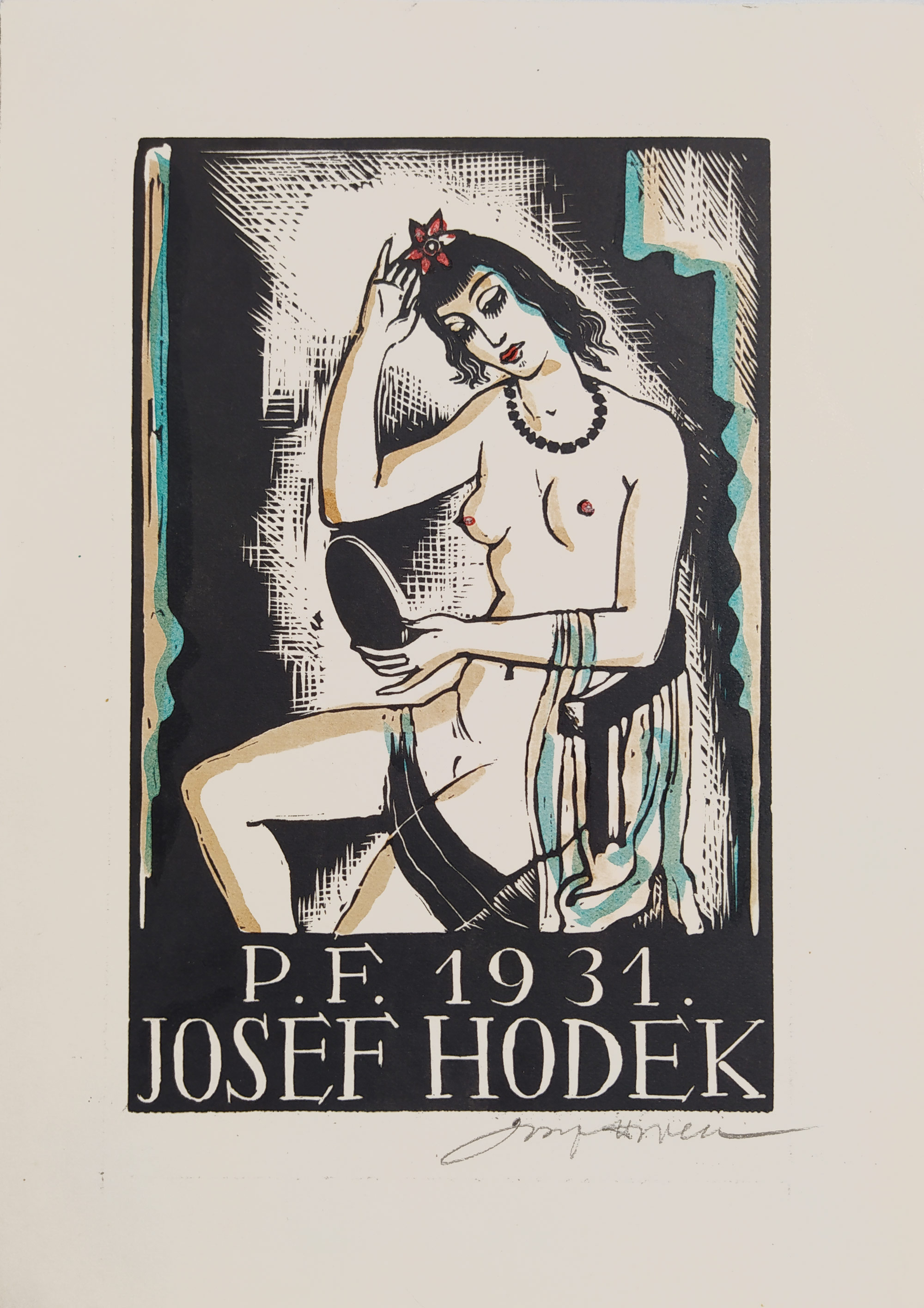 - Hodek Josef mladší – PF 1931 Josef Hodek, Novoročenka autora, barevný dřevoryt, 1930