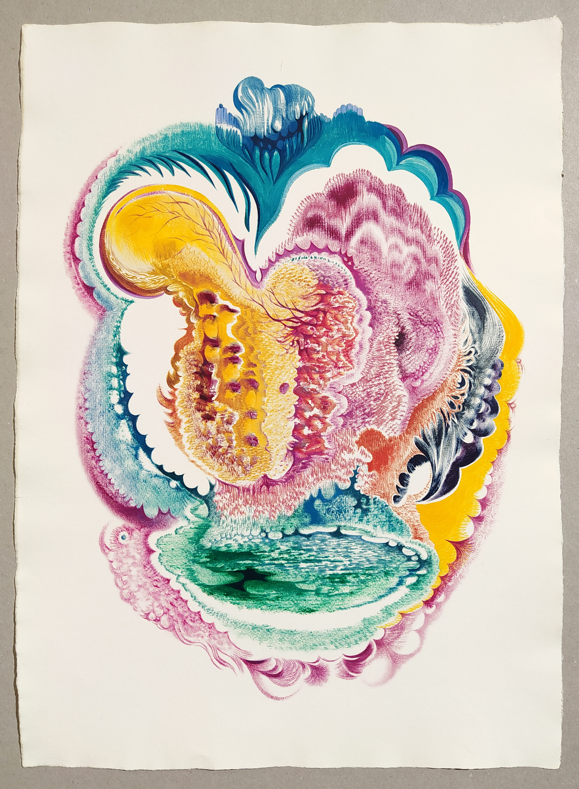 Holcová Veronika – Studánka, olejomalba na ručním papíře Losín, 2023. Signováno tužkou na rubu s datací a názvem díla. Celkový rozměr: 58 cm × 42 cm.