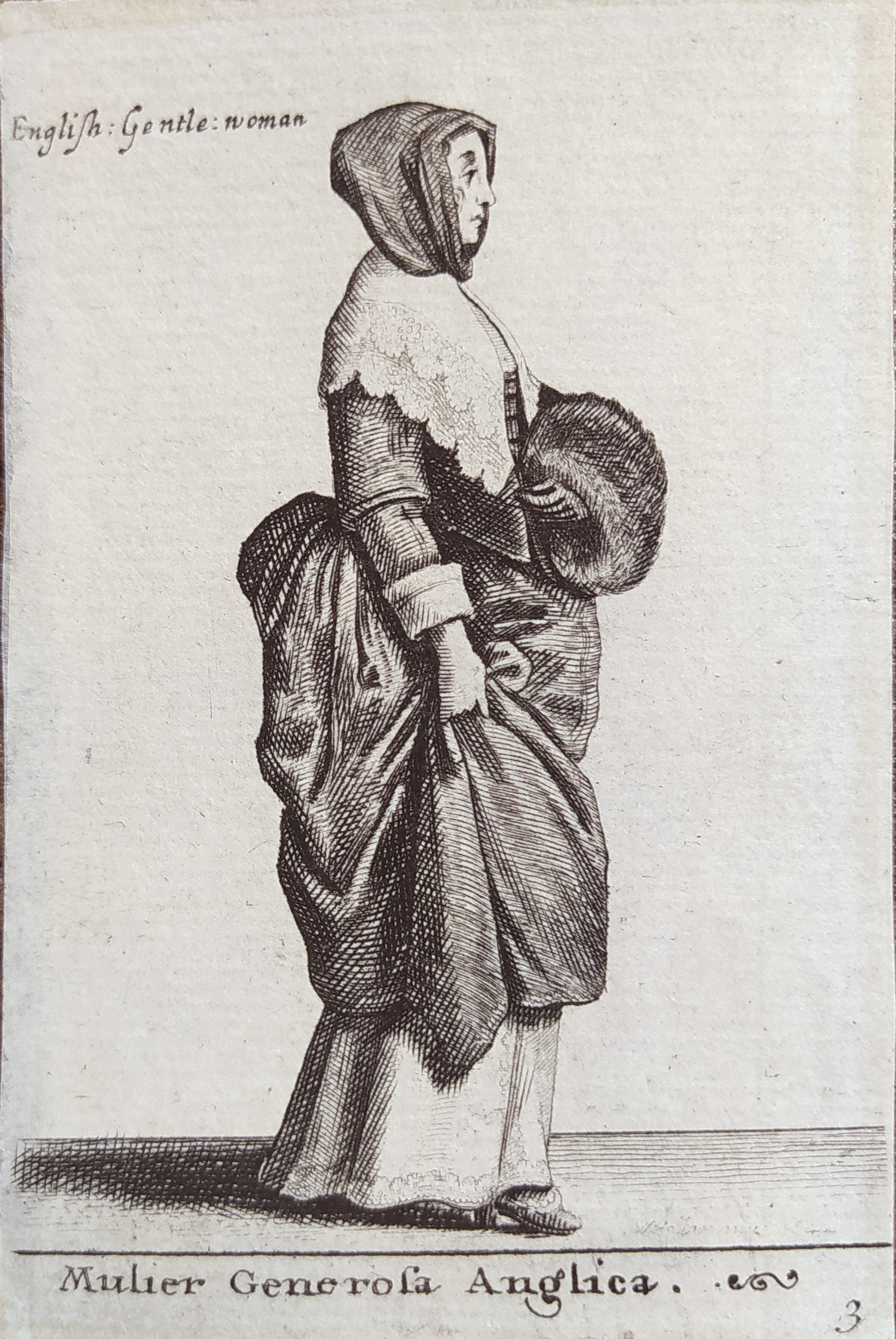 Václav Hollar – Vznešná anglická žena „Mulier Generosa Anglica“, Parthey 1888, původní lept, 1642. Signatura typograficky v desce vpravo dole: W. Hollar fecit (málo čitelné). Celkový rozměr: 9,8 × 6,4 cm.