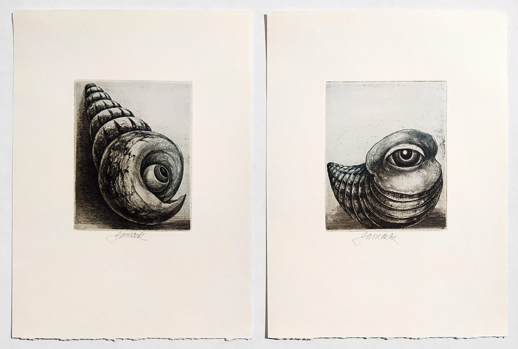 Janíček James – Ulita I + Ulita II, dva původní lepty, 2001. Signováno tužkou uprostřed dole. Celkový rozměr: á 21,7 cm × 16,2 cm.
