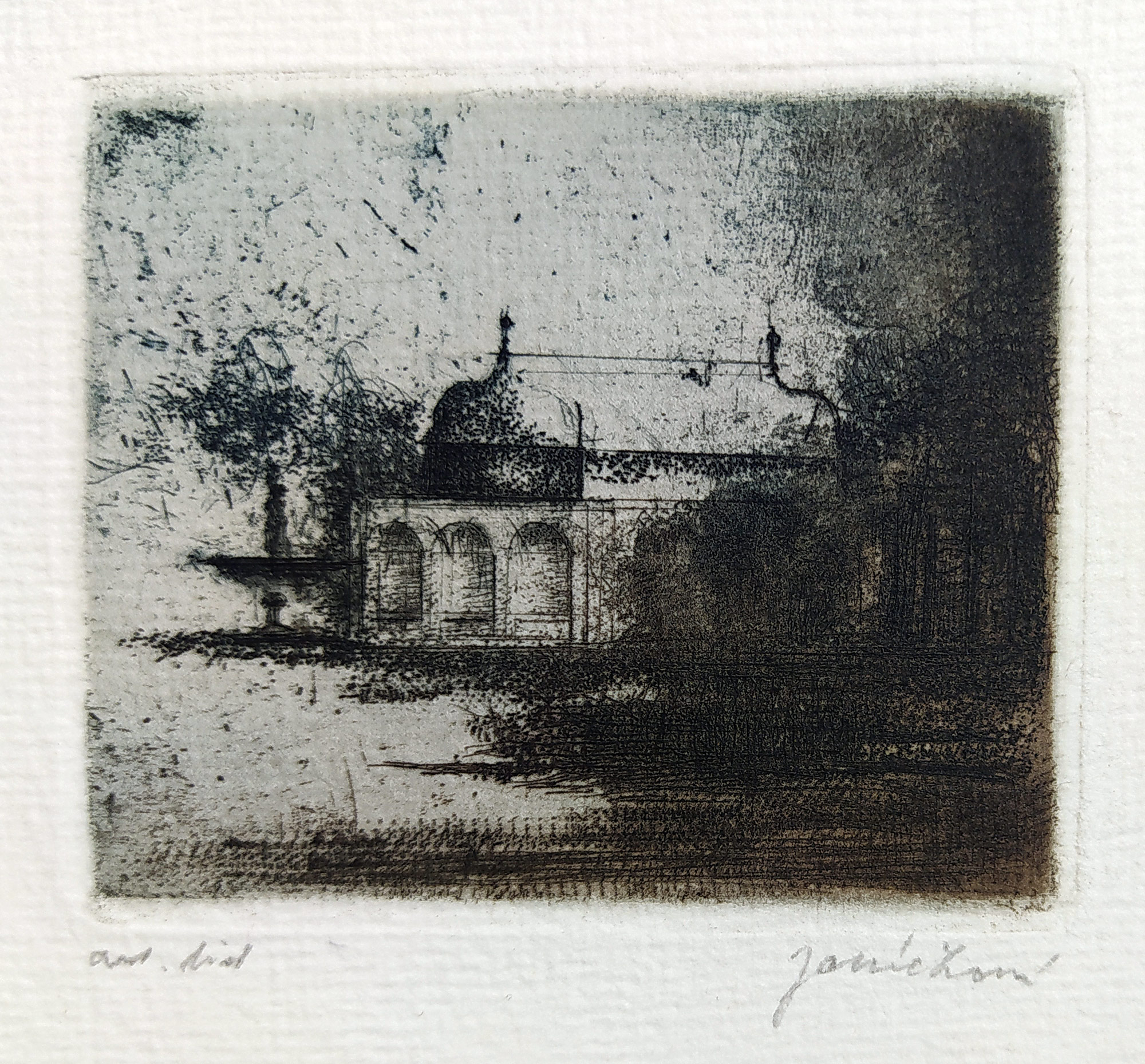 Janíčková Eva – Letohrádek, barevný lept, autorský tisk, nedatováno. Signováno tužkou vpravo dole. Celkový rozměr: 14,9 cm × 10,4 cm.